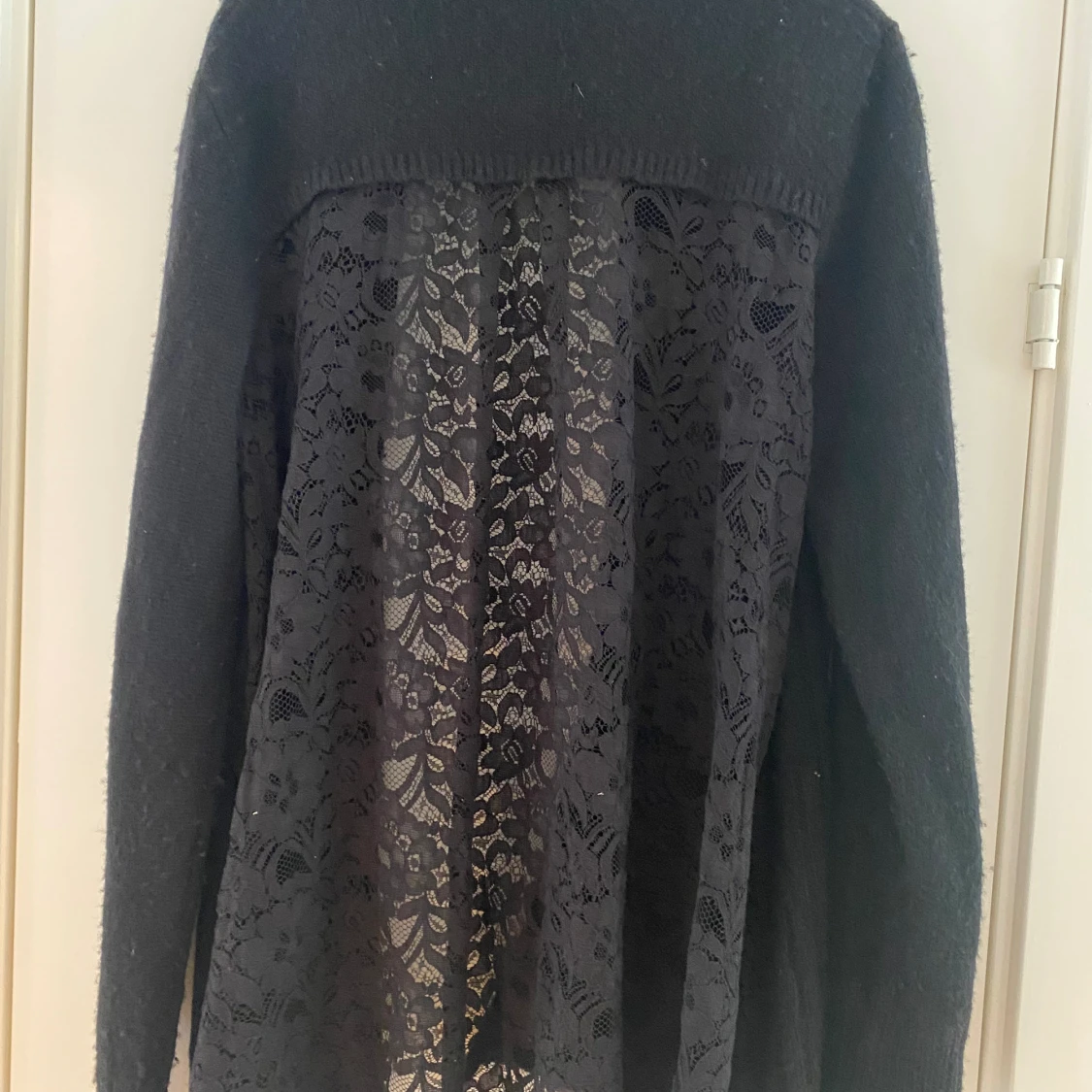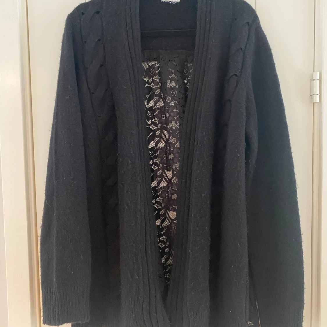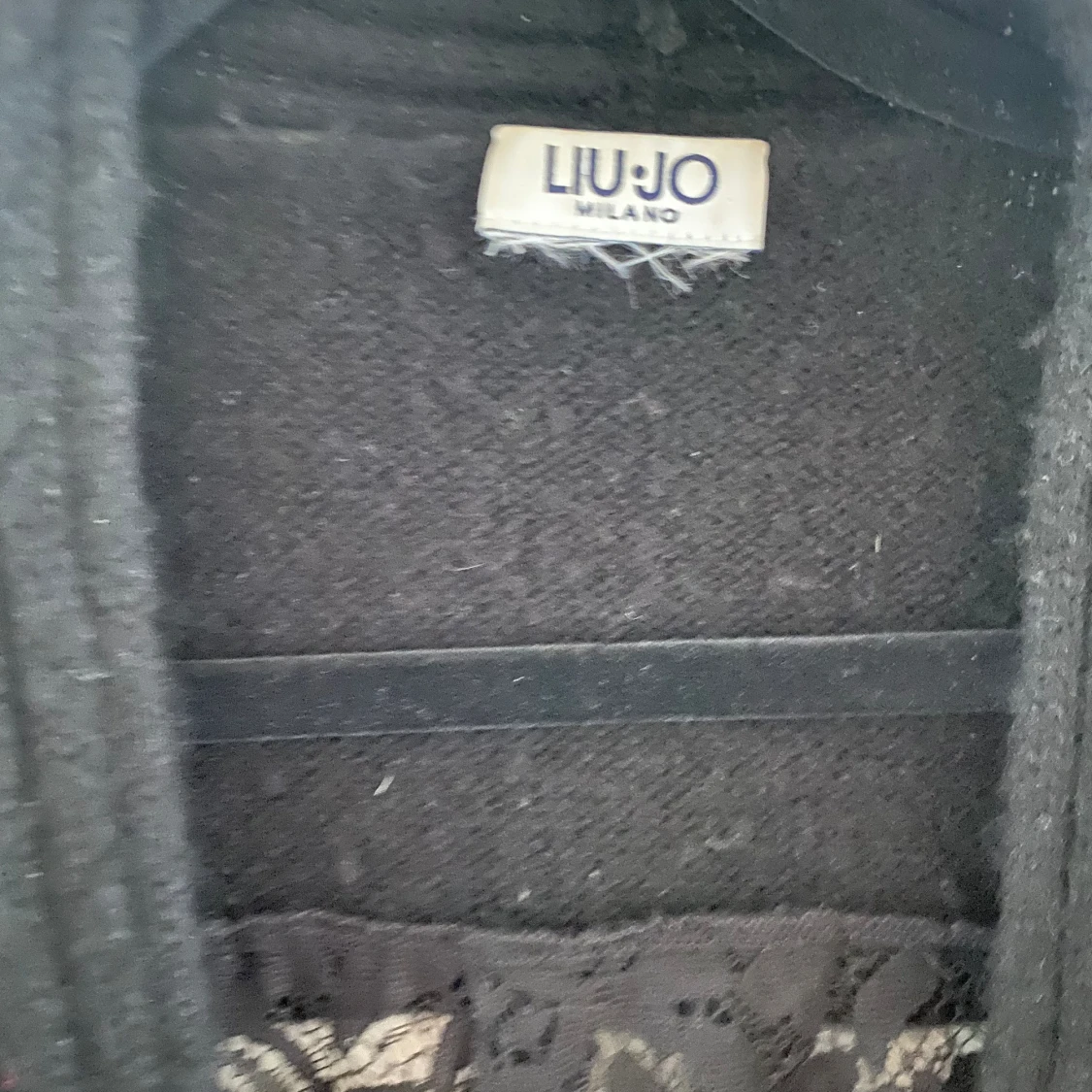 Svart öppen kofta med spets på baksidan i strl L från Liu Jo. Lappen med strl är bortklippt men jag vill minnas att det är en strl L. Dubbelkolla måtten nedan. Mått Över bröstet: ca 67 cm Längd från axeln: ca 76 cm Koftan är lite nopprig.