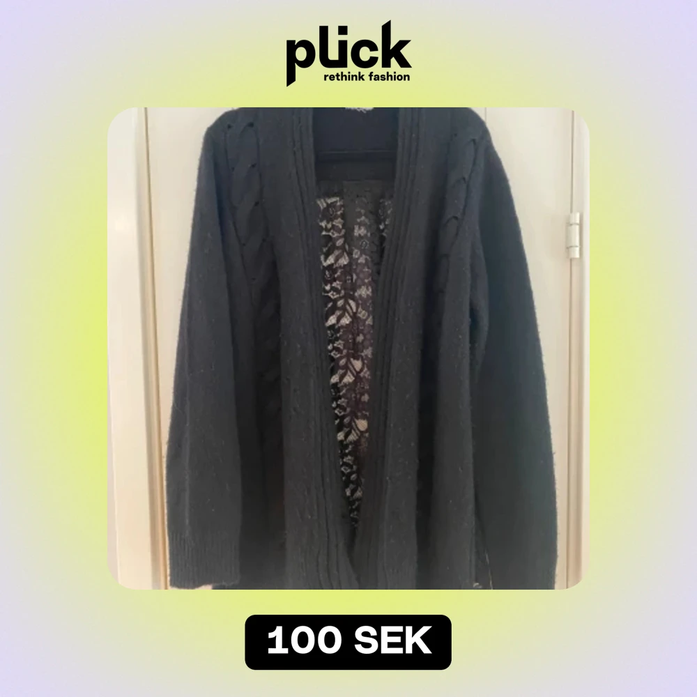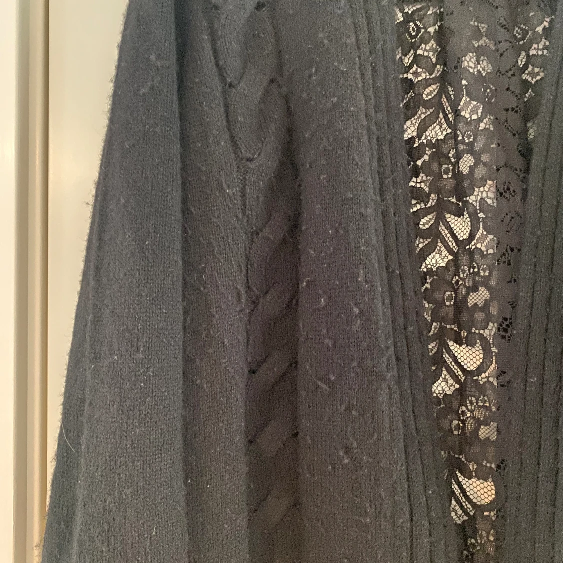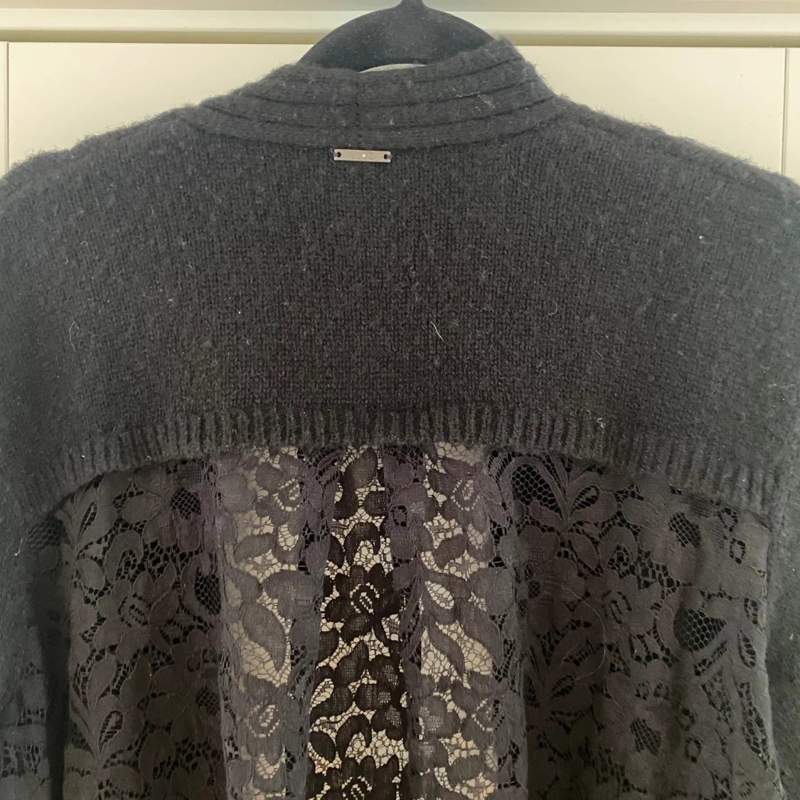Svart öppen kofta med spets på baksidan i strl L från Liu Jo. Lappen med strl är bortklippt men jag vill minnas att det är en strl L. Dubbelkolla måtten nedan. Mått Över bröstet: ca 67 cm Längd från axeln: ca 76 cm Koftan är lite nopprig.