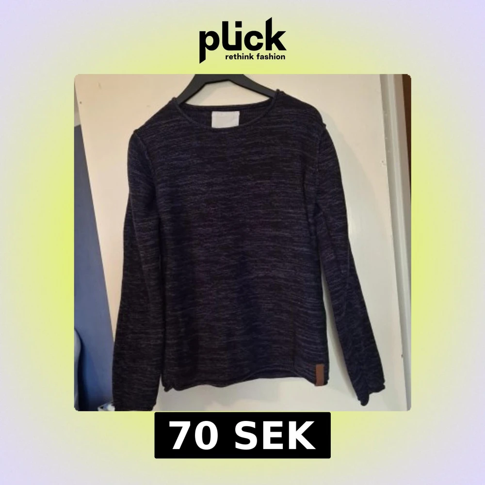 Mysig mörkblå stickad tröja med diskret melerat mönster och rund halsringning. Tröjan har långa ärmar och en liten brun detalj nertill. Perfekt för lager-på-lager under kyliga dagar.