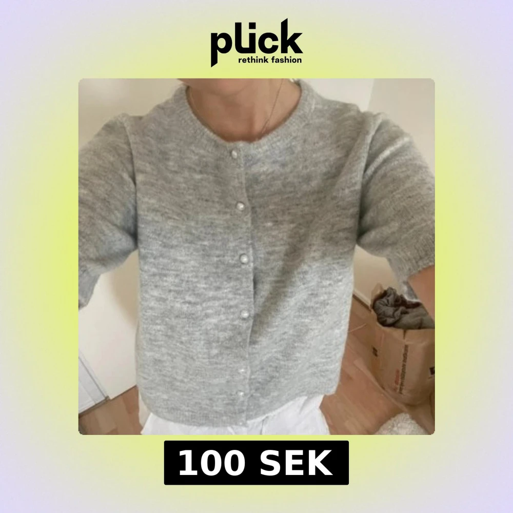 Superfin ljusgrå stickad kofta med korta ärmar och pärlknappar framtill. Koftan har en rund halsringning och är i en mjuk, mysig stickad kvalitet. Perfekt att slänga över en topp.