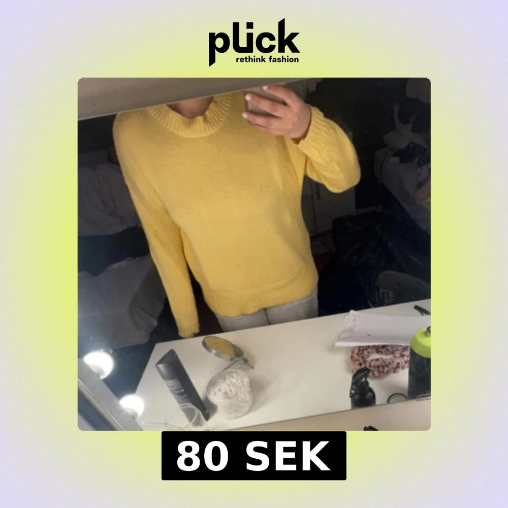 Säljer en söt gul stickad tröja med rund hals och långa ärmar. Perfekt för att liva upp garderoben med en färgklick. Tröjan har en klassisk passform och ribbade muddar vid ärmslut och nederkant.