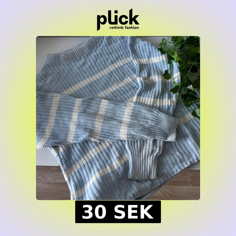 Supermysig ljusblå stickad tröja från 157 med vita ränder. Tröjan har en relaxed fit, bred ribbad mudd vid ärmslut och halsringning samt lång ärm. Perfekt för lager-på-lager och chill dagar. Tyvärr fått lite smink fläckar vid halsen men det går kanske bort i tvätten, se bild. Katt finns i hemmet 🌸