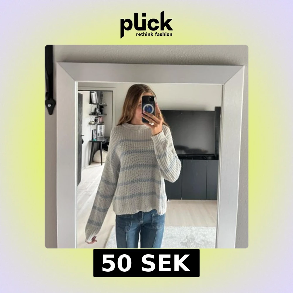 Stickad blå-vit randig tröja. Lite av sömmen längst ner där bak har gått upp, men inget man tänker på. Finns även någon enstaka fläck. Hör av dig om du har några frågor eller funderingar!🩷