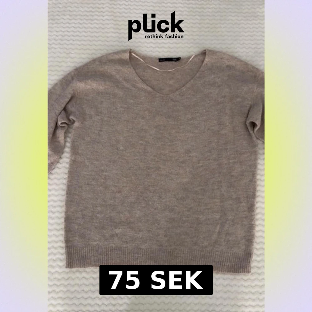 Mysig beige stickad tröja från 157 med v-ringad hals och långa ärmar. Tröjan har ribbade muddar vid ärmslut och nederkant, perfekt för lager-på-lager under hösten och vintern. Enkel och stilren design som funkar till jeans eller kjol.