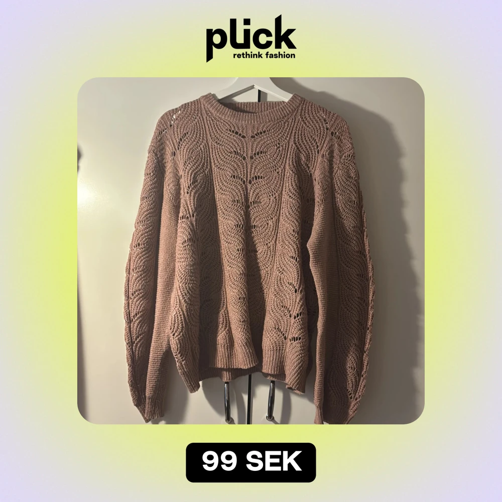 Säljer en mysig rosa stickad tröja med ett vackert hålmönster. Tröjan har långa ärmar i ballongstil och en rund halsringning.