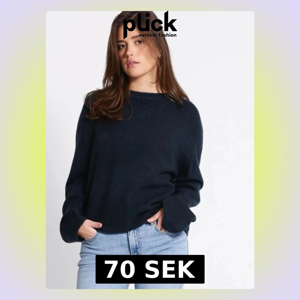 Mysig mörkblå stickad tröja med avslappnad, loose passform och långa ärmar. Perfekt för lager-på-lager och enkel att styla med jeans eller kjol. Tröjan har en klassisk rund halsringning och breda muddar vid ärmsluten.