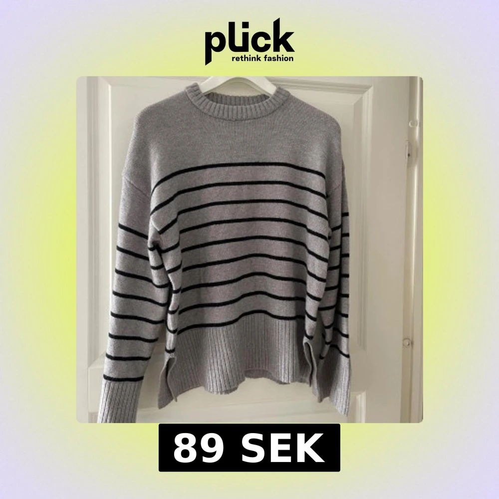 Säljer en grå stickad tröja med svarta horisontella ränder. Tröjan har ribbade muddar och nederkant samt lång ärm. Perfekt för lager-på-lager och chill dagar. Oversized fit med slits i sidorna för extra komfort.