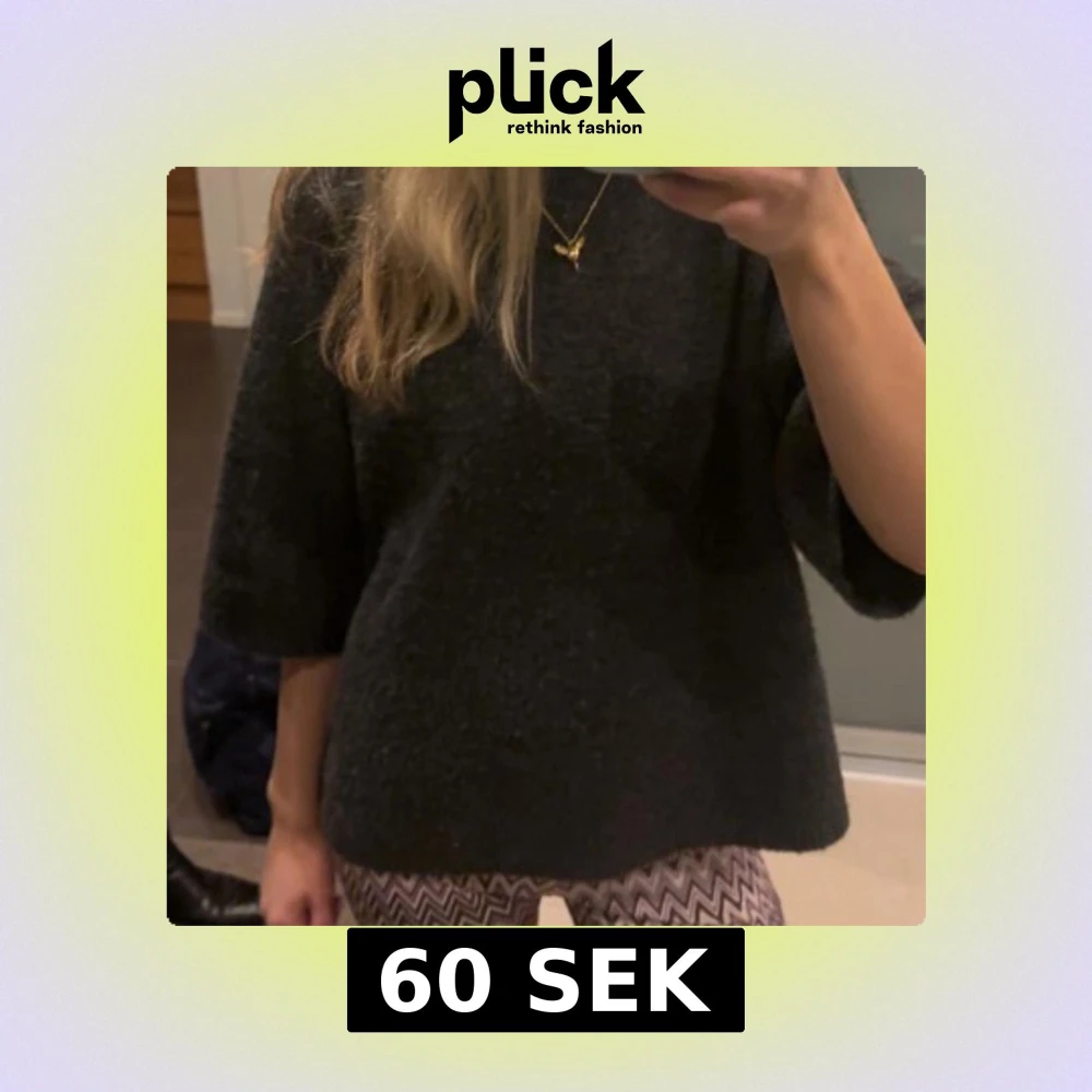 Säljer en mörkgrå stickad tröja från 157 med rund hals och halv-långa ärmar. Modellen är loose fit och har en enkel, clean look som är lätt att styla. Perfekt för dig som gillar chill och oversized vibe.