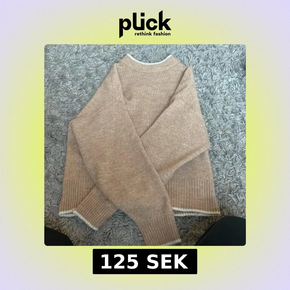 Mysig beige stickad tröja med ribbade muddar och vita detaljer vid ärmslut, nederkant och halsringning. Tröjan har en klassisk passform och är perfekt för kyligare dagar.