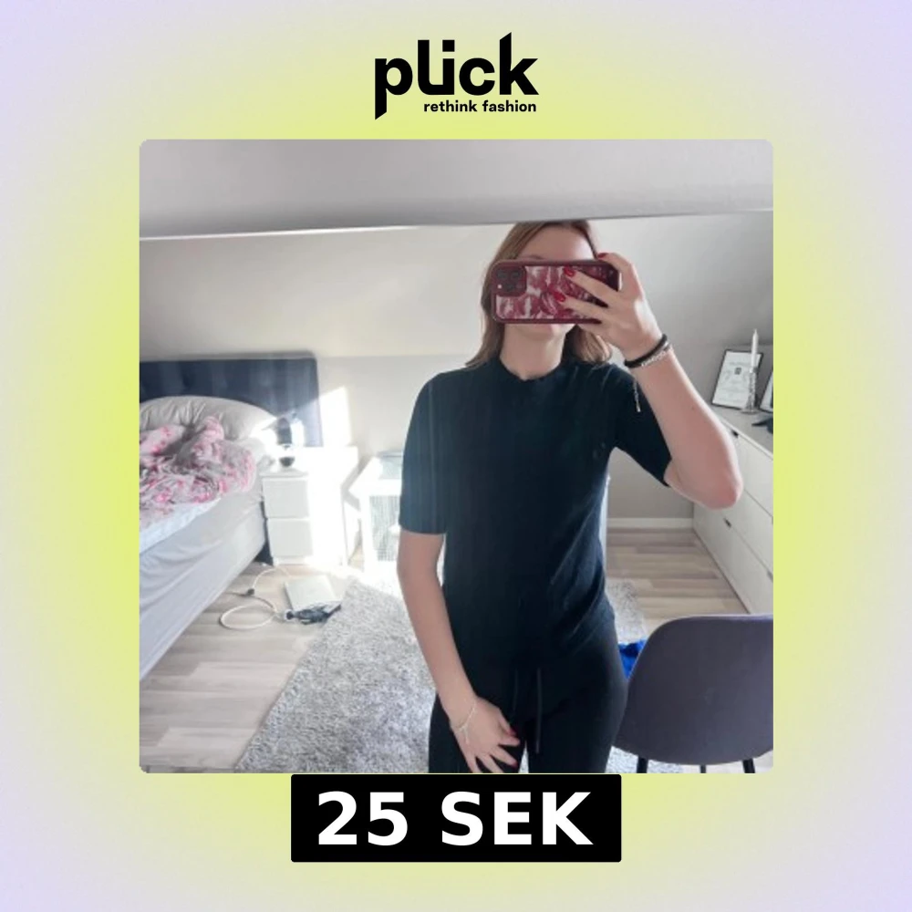 En svart stickad topp med korta ärmar och rund hals. Modellen är enkel och stilren, perfekt att matcha med både jeans och kjol. Materialet är mjukt och följsamt, vilket gör den skön att bära hela dagen.