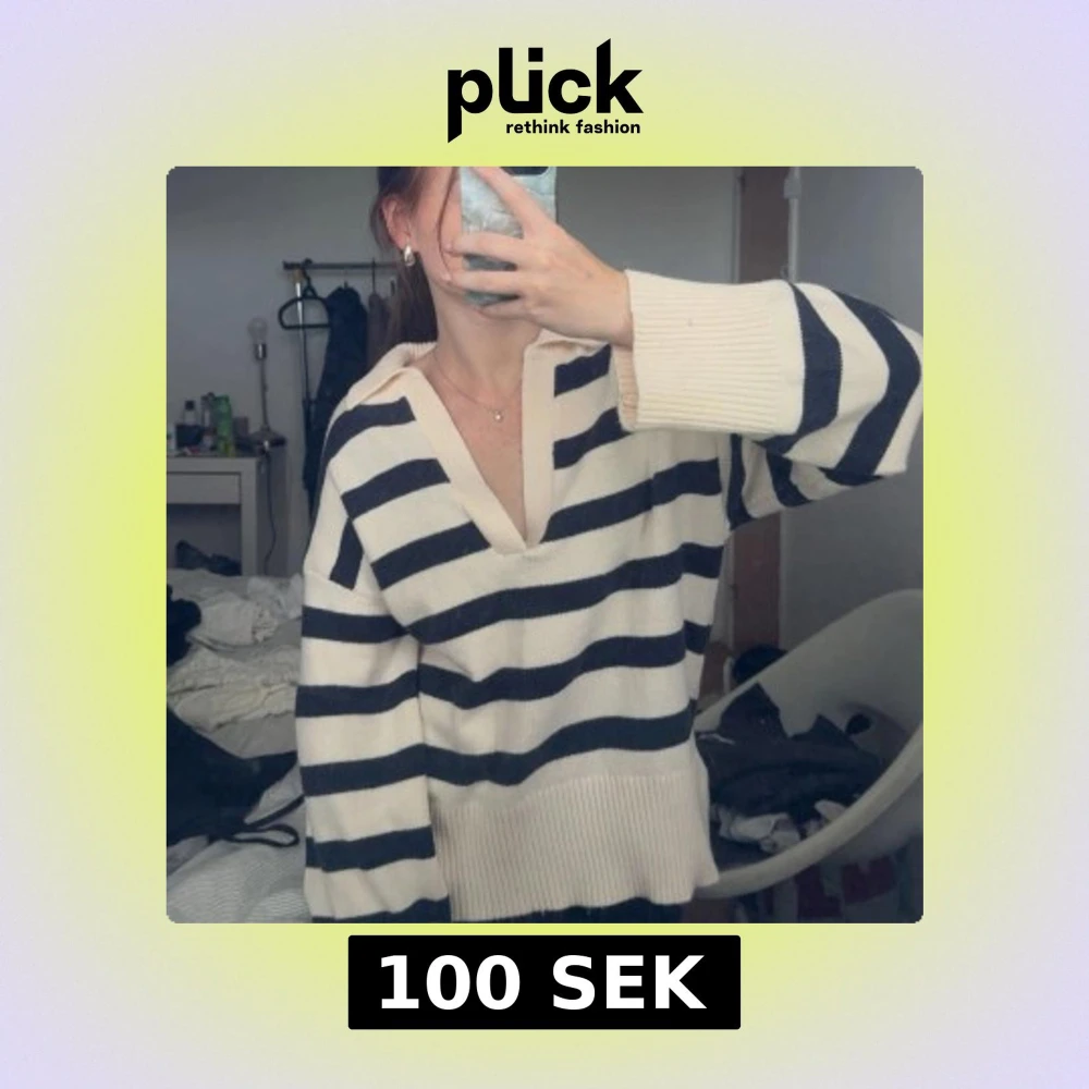 Supermysig stickad tröja från 157 i XS med breda svarta och vita ränder. Tröjan har v-ringning, krage och långa ärmar med breda muddar. Perfekt för lager-på-lager och chill vibes.