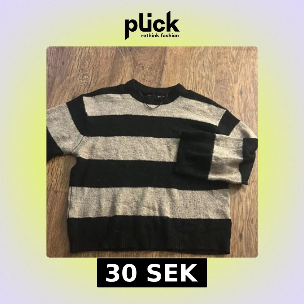 Säljer en stickad tröja med breda svarta och beige ränder. Tröjan har rund halsringning och långa ärmar. Perfekt för dig som gillar en avslappnad och trendig stil. Lite knopprig annars fint skick