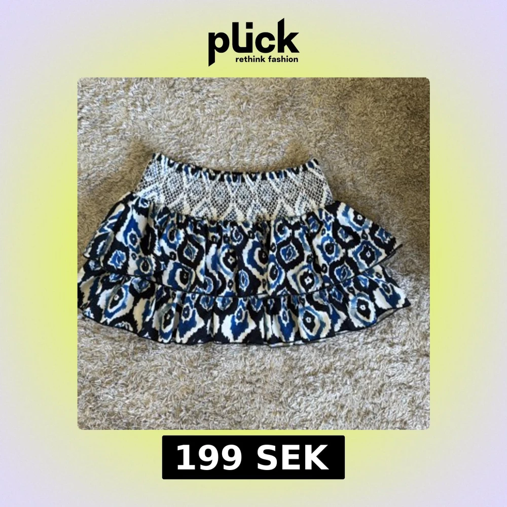Kort volangkjol med blått, svart och vitt mönster från Francis. Kjolen har bred resår i midjan med ett stickat mönster och två lager volanger. Skulle säga att den är lågmidjade men om man tycker den är för lång kan man även vika ner resåren💗