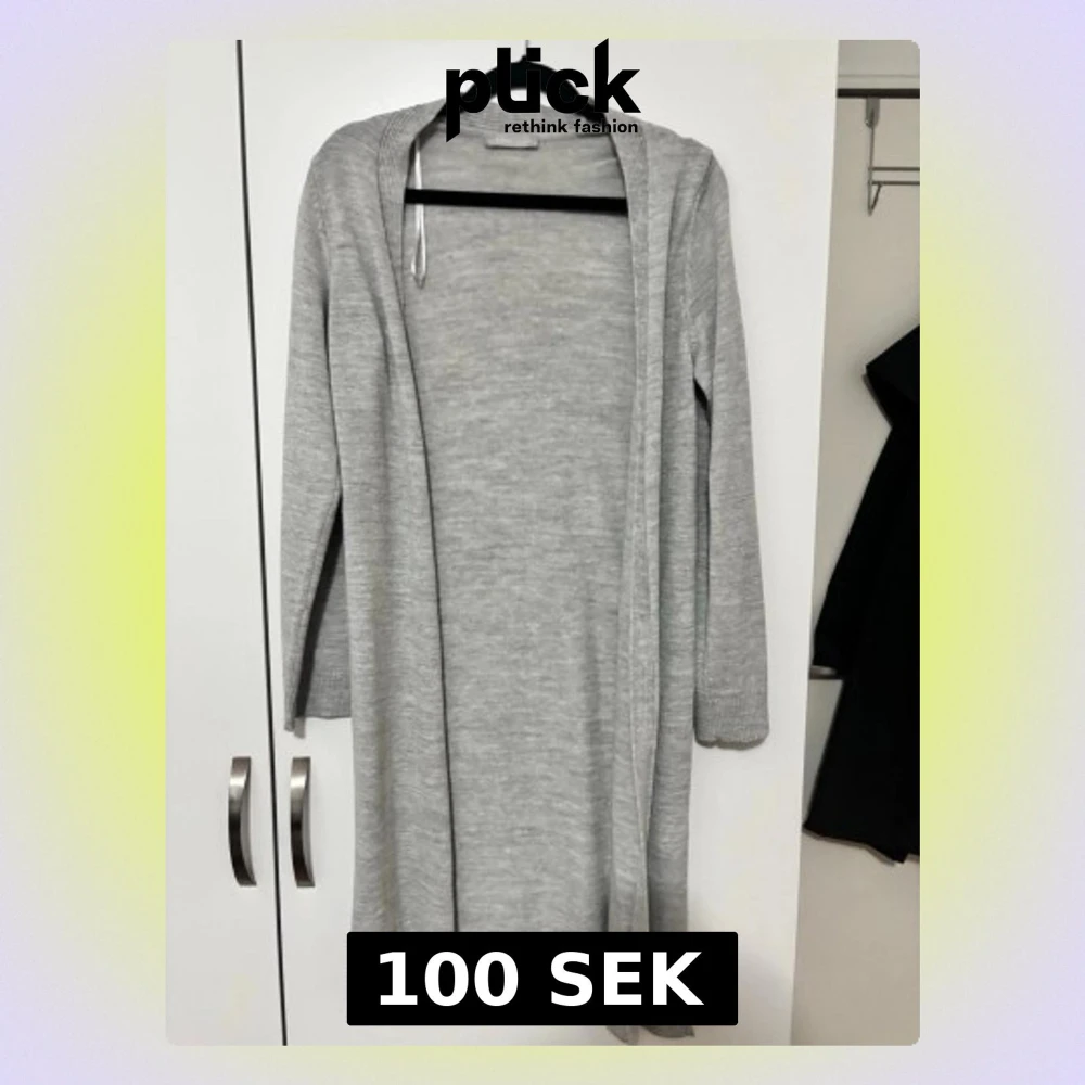 Säljer en lång och skön grå kofta med ribbade detaljer vid krage och ärmslut. Koftan är öppen framtill och har långärmade ärmar, perfekt att slänga över en t-shirt eller topp. Enkel och stilren design som passar till många outfits.