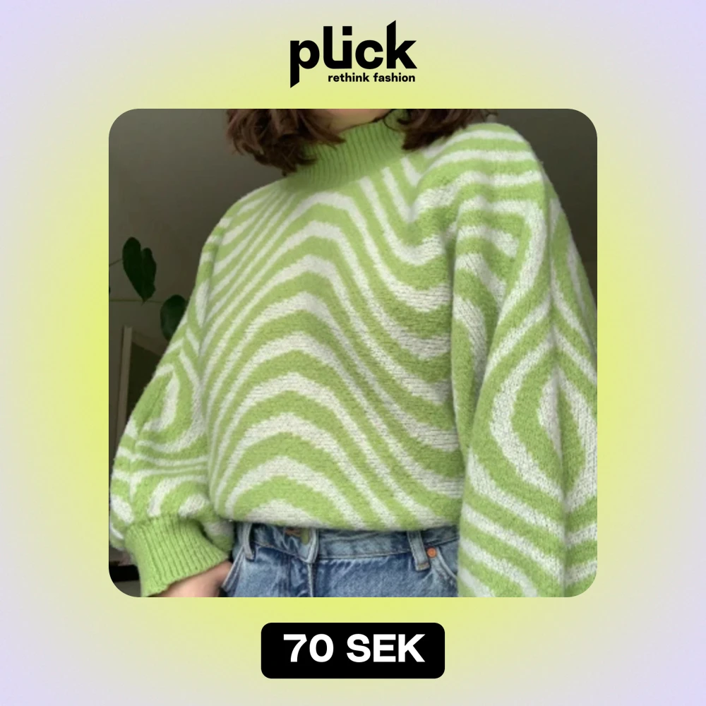 En grön och vit mönstrad stickad tröja. Den landar på midjan och har mycket rum i armarna. Bra skick. Storlek S men passsr även mig och jag bär storlek M.