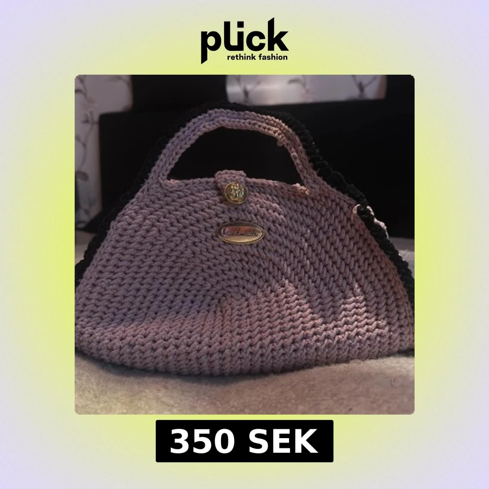 Unik handväska i rosa med svarta detaljer, stickad i grovt garn. Väskan har en snygg guldig knapp och ett handtag upptill. Perfekt accessoar för dig som vill sticka ut med något personligt och kreativt.