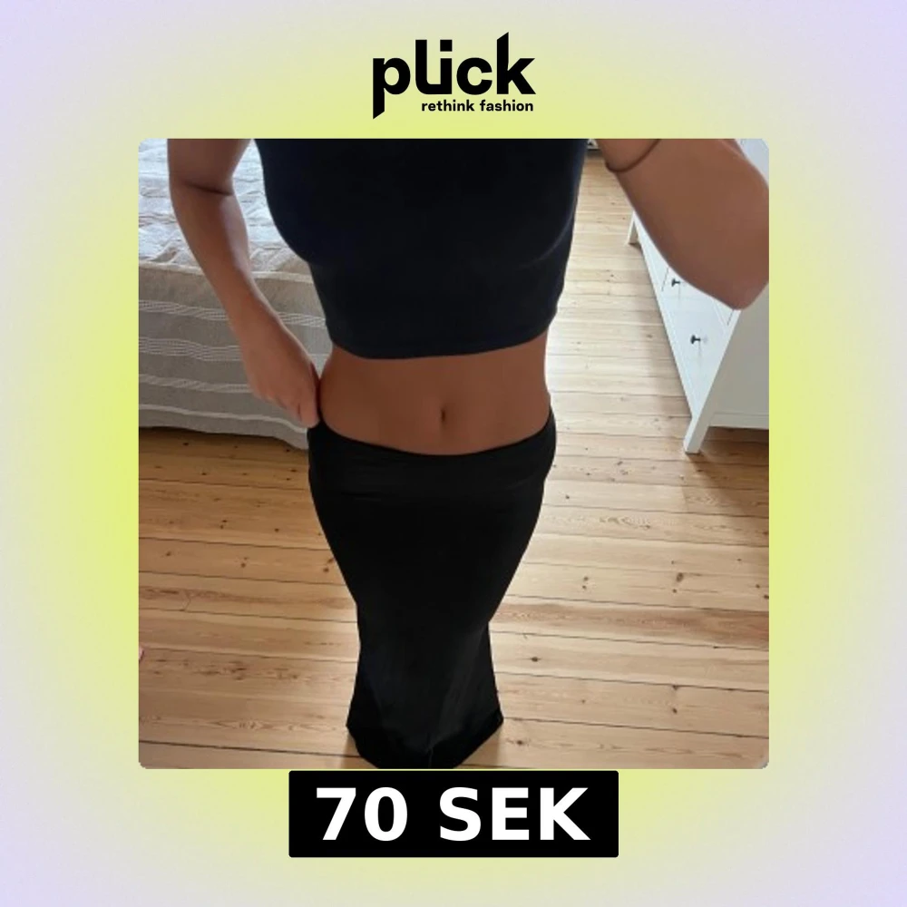 Säljer en svart långkjol med figurnära passform och lätt utsvängd nederdel. Kjolen är enkel och stilren, perfekt att matcha med crop tops eller stickade tröjor. Materialet känns stretchigt och följsamt, vilket gör den bekväm att bära hela dagen.