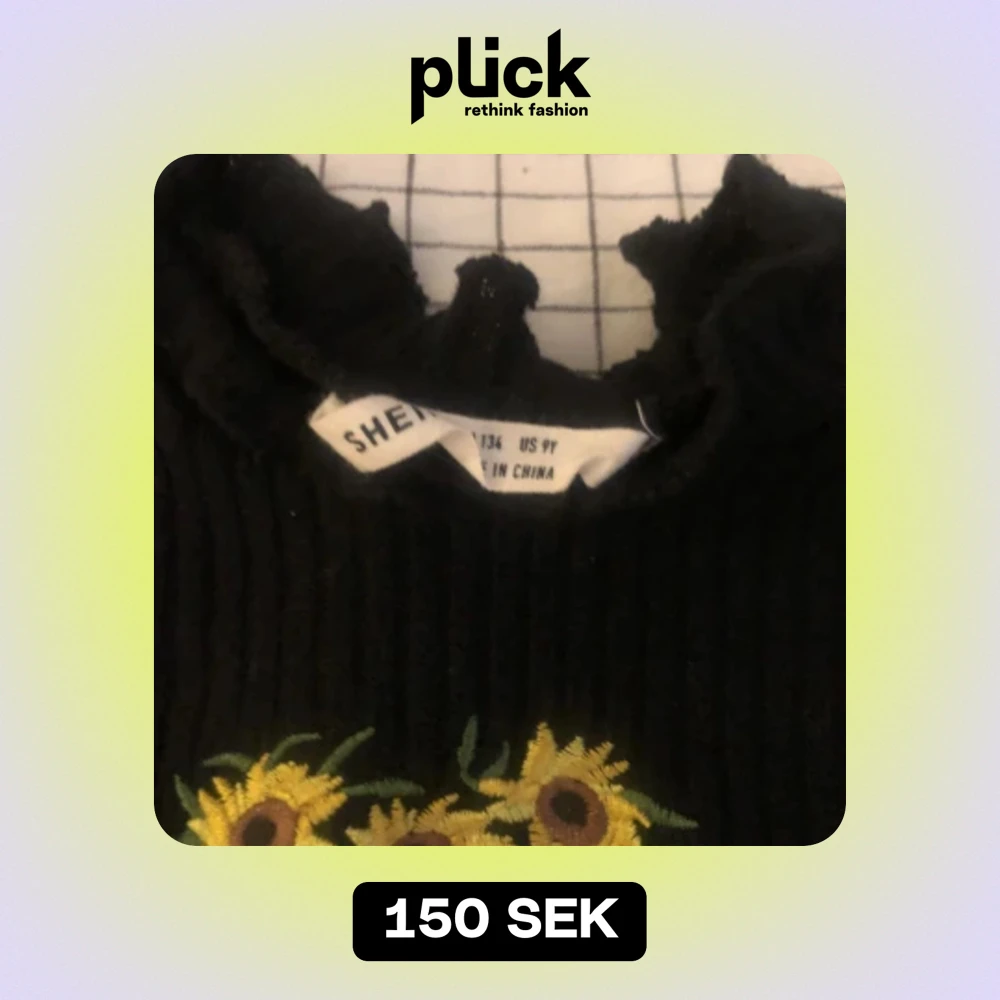 Svart , lång med solros detaljer! Lite korvat sytt på ärmar och botten av klänningen. Stretchigt material, lite ”randigt” tyg. strl 134 Fint skick, endast testad!