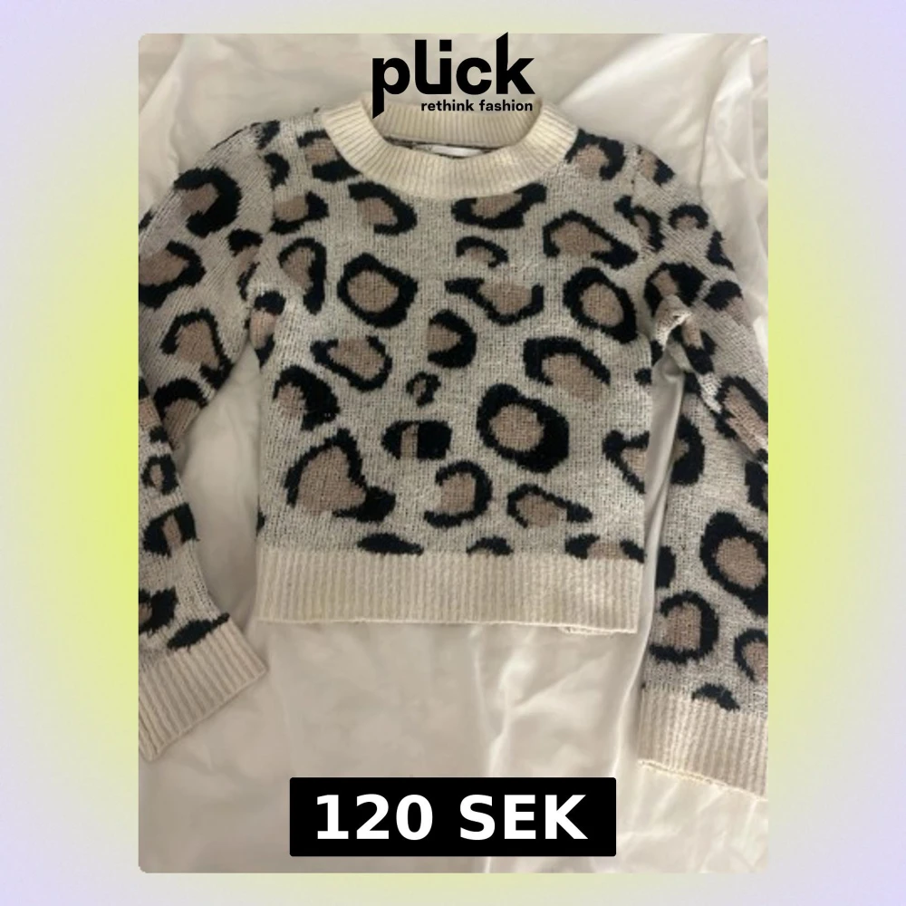 Säljer en snygg stickad tröja med leopardmönster i beige, svart och grått. De står M men skulle själv säga xs