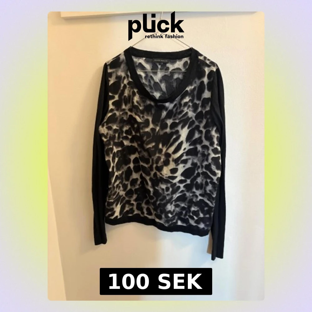 Säljer en svart och vit leopardmönstrad tröja från Second Female. Tröjan har långärmade svarta ärmar och ett mjukt, stickat material. Perfekt för dig som vill ha en cool och unik look med lite edge.