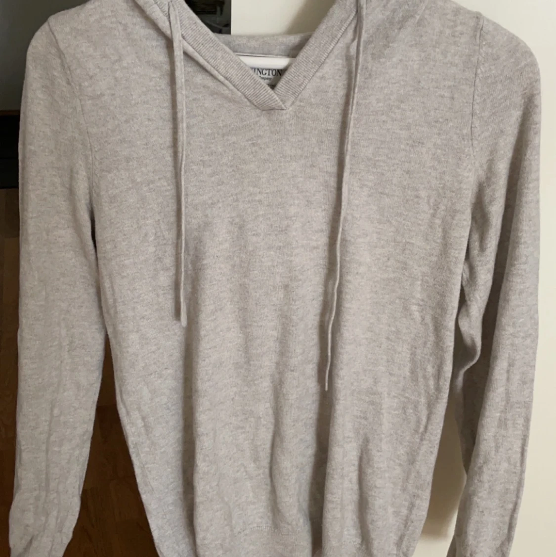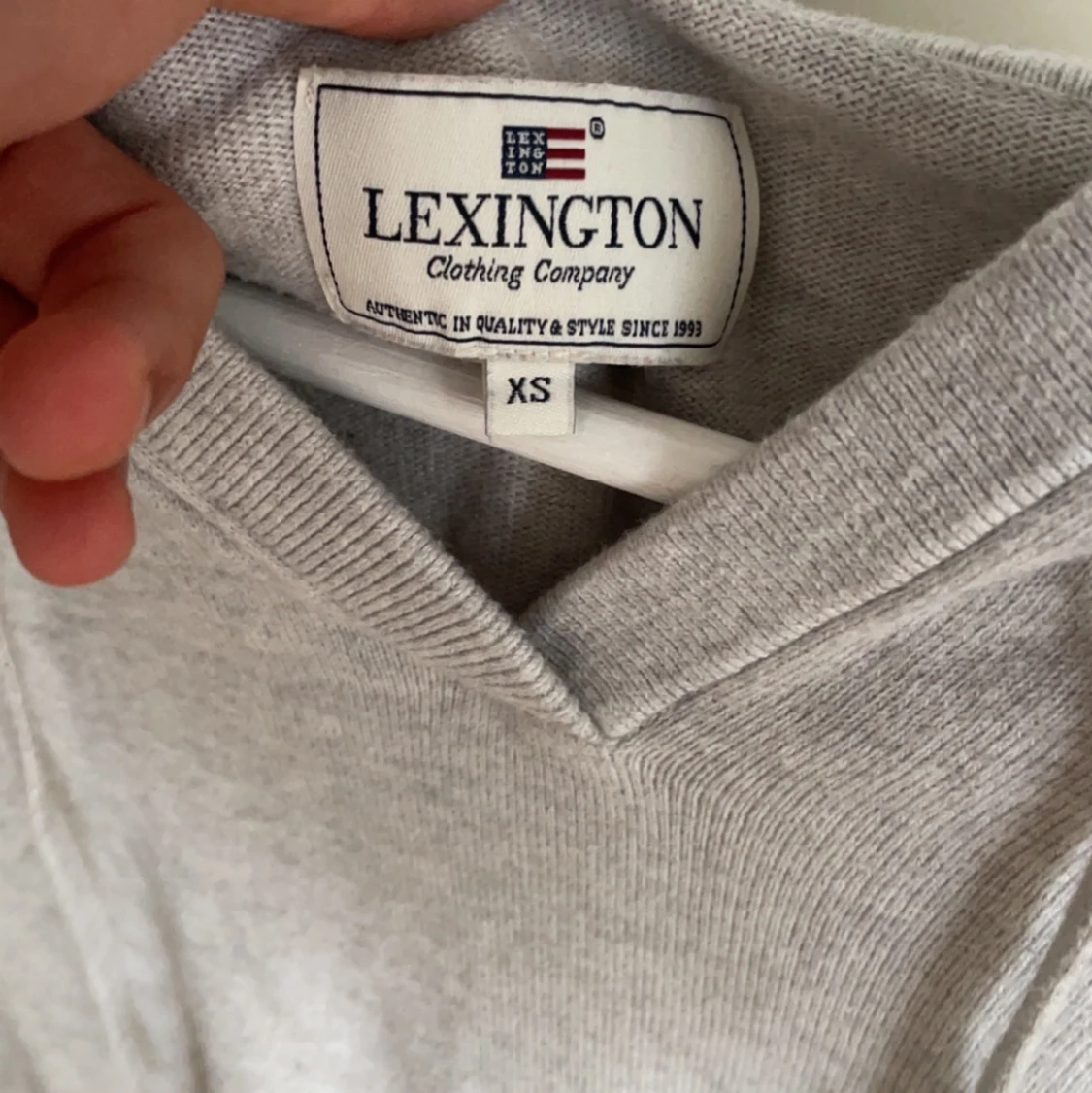 En grå kashmirtröja, den är v-ringad med 5% kashmir o resten bomull från lexington. Dam storlek!