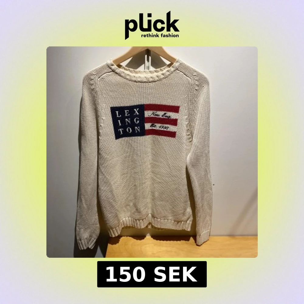 Säljer en beige stickad tröja från Lexington med amerikanskinspirerad flagga och text framtill. Tröjan har rund halsringning, ribbade muddar och lång ärm. Perfekt för dig som gillar klassisk och avslappnad stil.