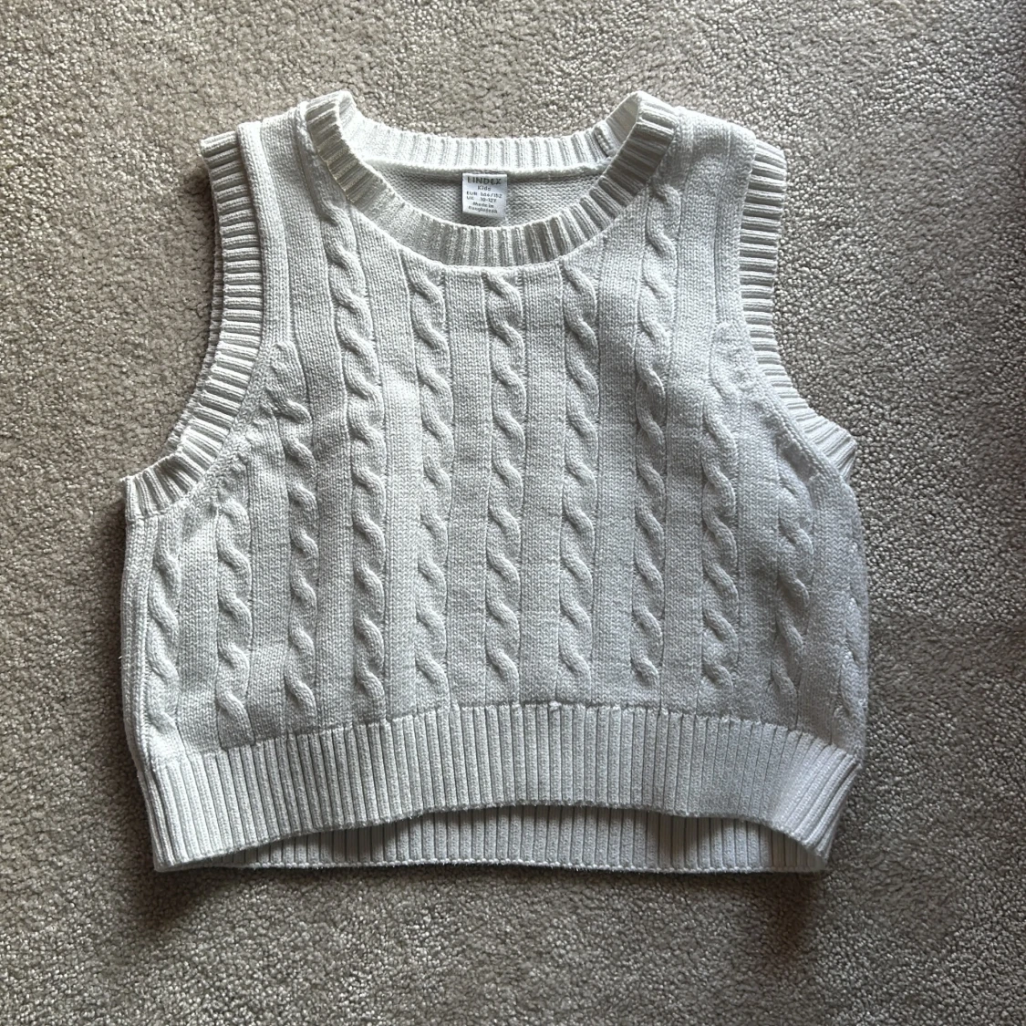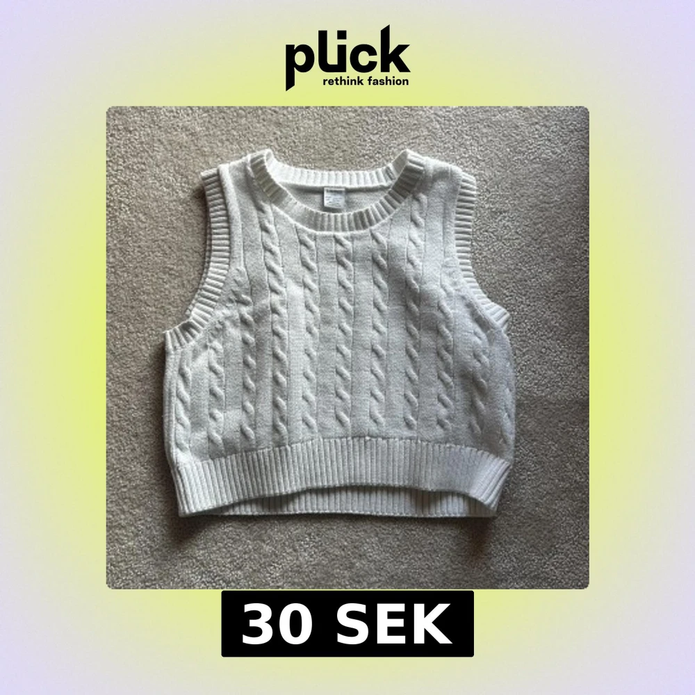 Säljer en snygg vit stickad väst från Lindex. Västen har ett klassiskt flätmönster och ribbade kanter. Perfekt för lager-på-lager-stil under svalare dagar. Tillverkad i en mjuk bomullsblandning.