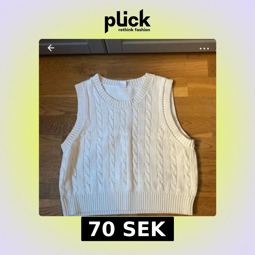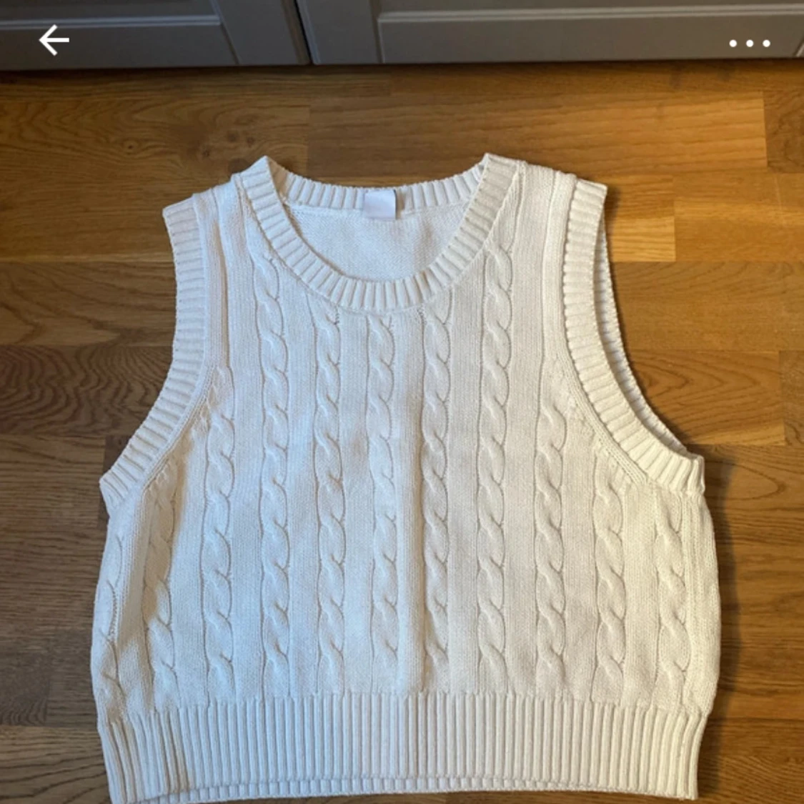 Säljer en stilren vit stickad väst med kabelstickat mönster. Västen har en rund halsringning och ribbade kanter vid ärmhål och nederkant. Perfekt för lager-på-lager-stil.