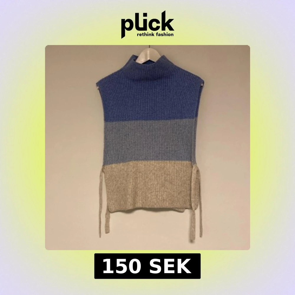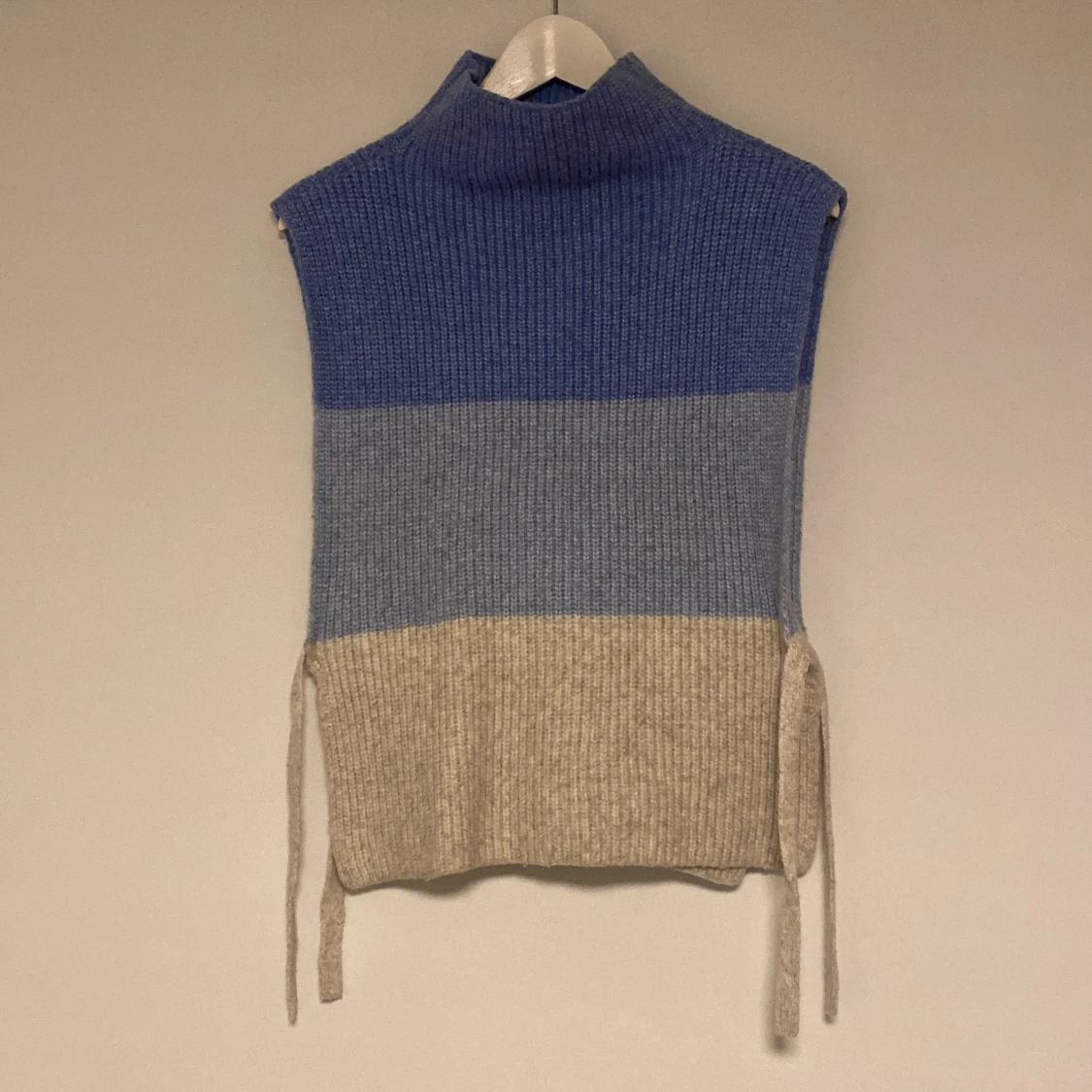 Säljer en stilren stickad väst i blått och beige. Västen har en hög krage och knytband på sidorna för en justerbar passform. Perfekt för lager-på-lager under kyligare dagar.