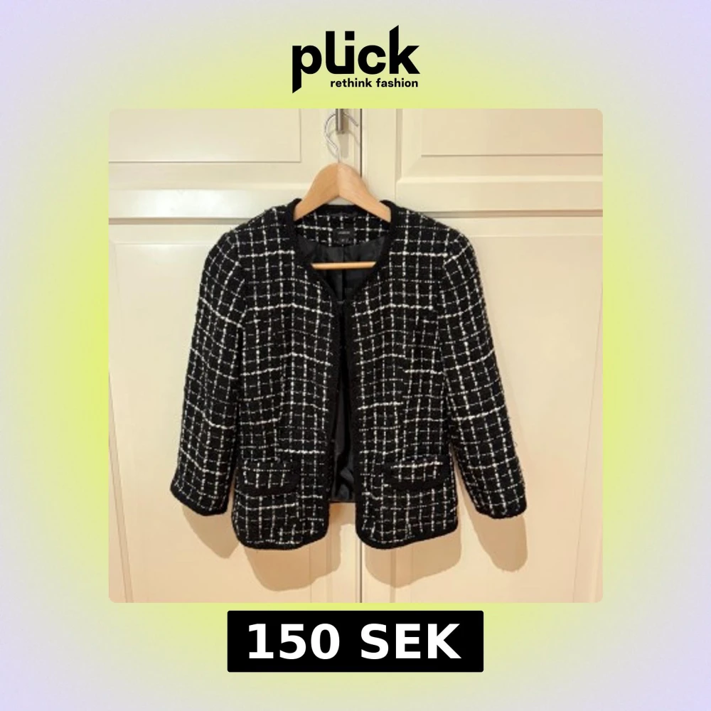 Snygg svart kavaj från Lindex i storlek 36 med vit rutigt mönster. Jackan har rundad hals, två fickor framtill och är helfodrad. OBS Det står att den är storlek 40 men den är extremt liten i storleken så det är storlek 36
