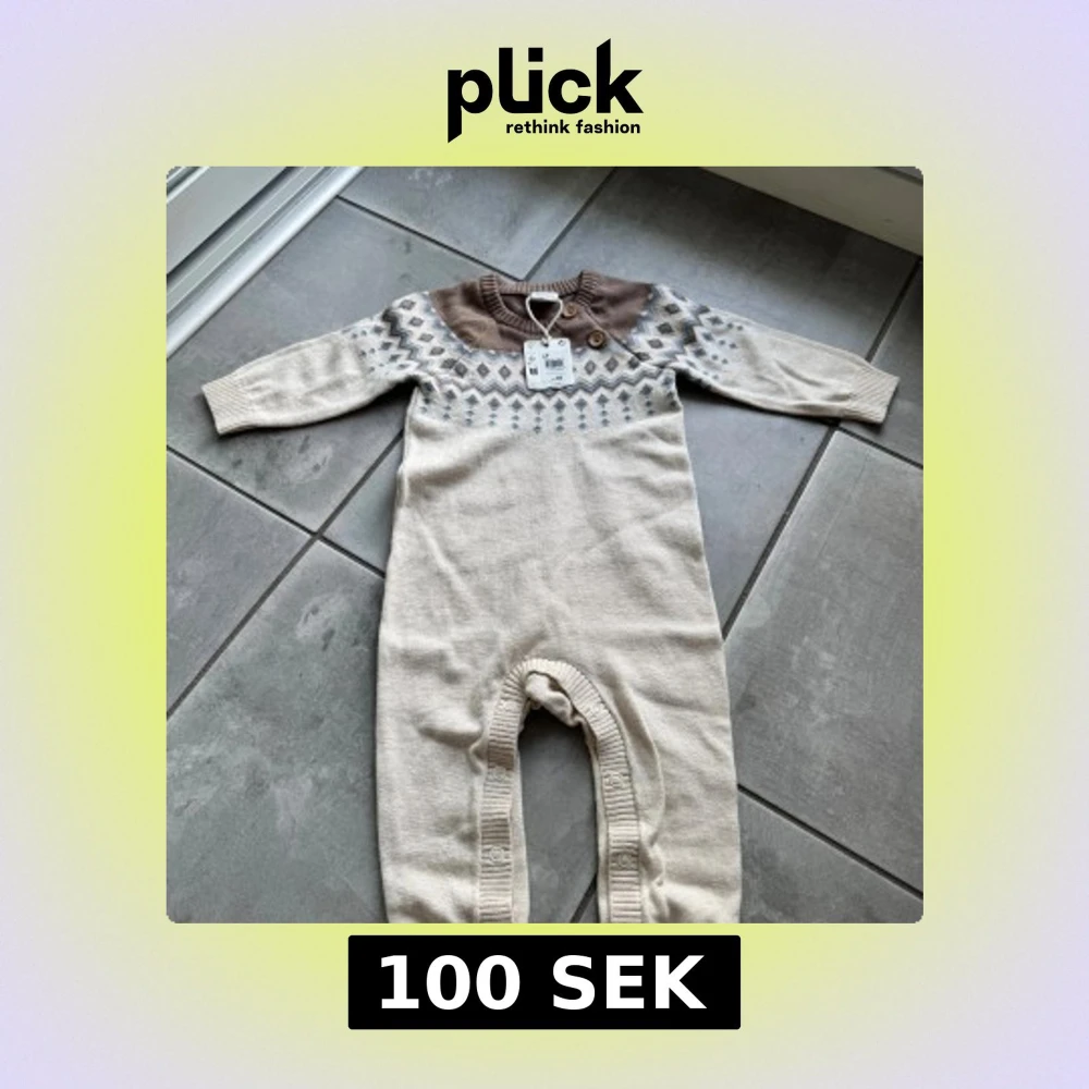 Supermysig stickad byxdress från Lindex i beige med brunt ok och mönster i blått och vitt. Långärmad modell med knappar vid axeln och tryckknappar längs benen för enkel påklädning. Perfekt för kyligare dagar och riktigt gullig stil.