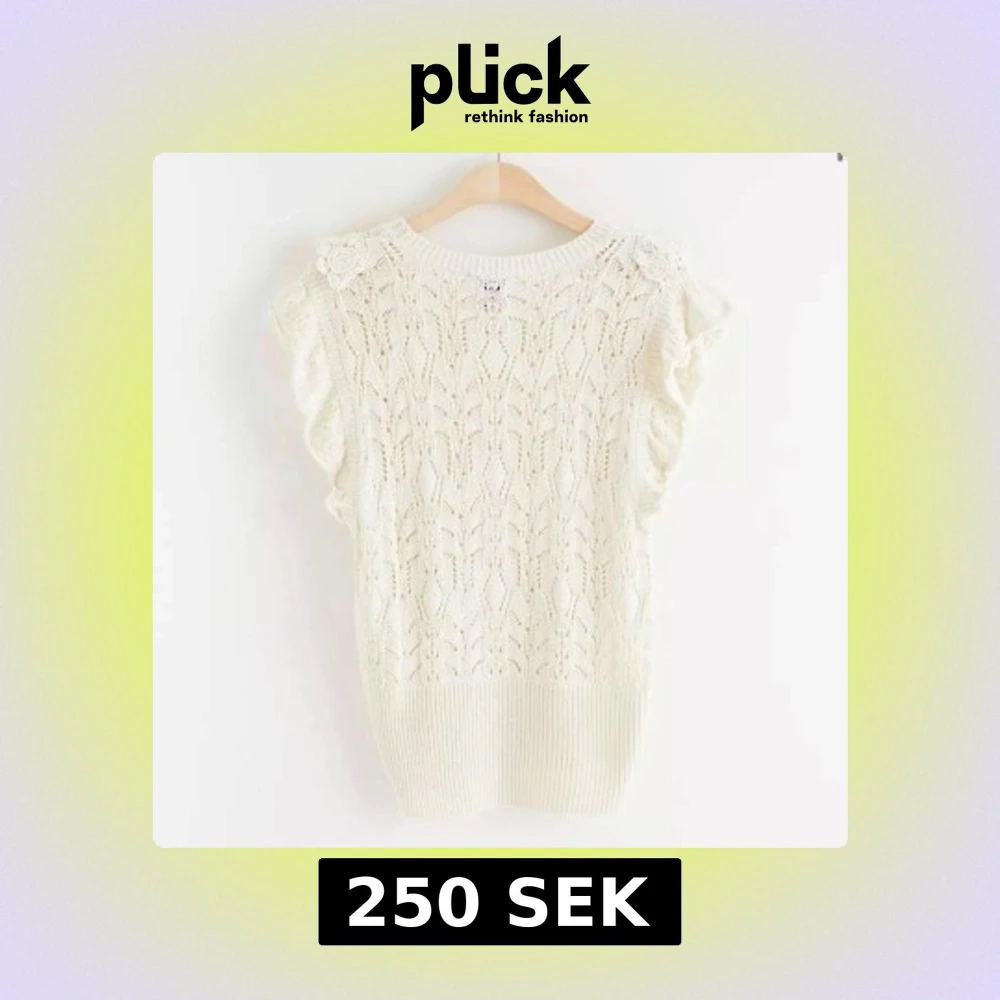 Säljer en söt vit stickad topp från Lindex med vackert spetsmönster och volangdetaljer vid ärmarna. Toppen är ärmlös och har en ribbad nederkant för en fin passform. Inga defekter.