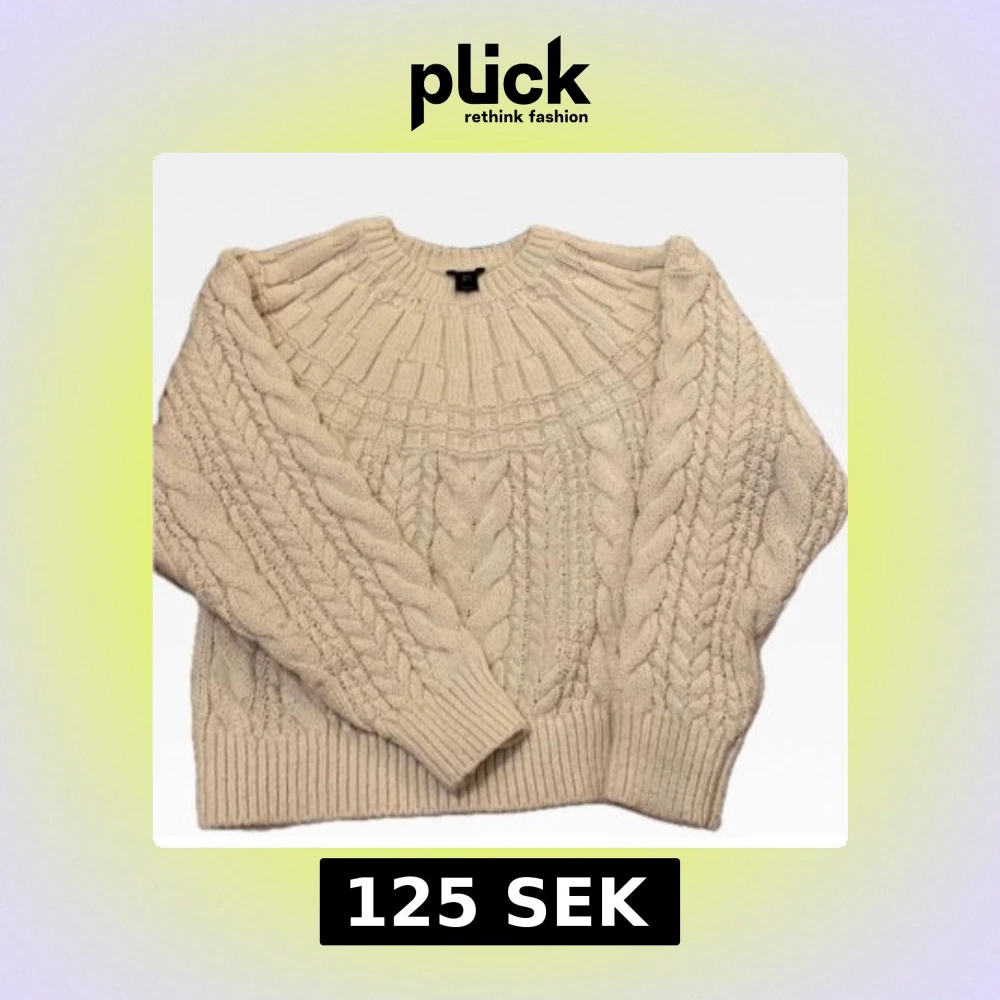 Mysig off white stickad tröja från Lindex i återvunnen polyesterblandning. Tröjan har ett klassiskt flätmönster och ribbade muddar vid ärmslut och nederkant. Perfekt för kyliga dagar! Mycket fint skick.