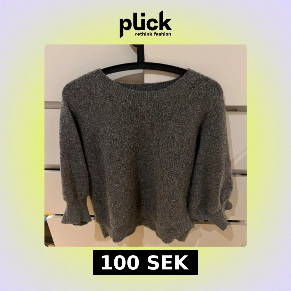 Mysig grå stickad tröja från Lindex med volangdetaljer vid ärmslut och nederkant. Perfekt för kyliga dagar. Den har trekvartsärmar! Passar mig som har S. Köpte den för 249kr säljer den för 100+frakt
