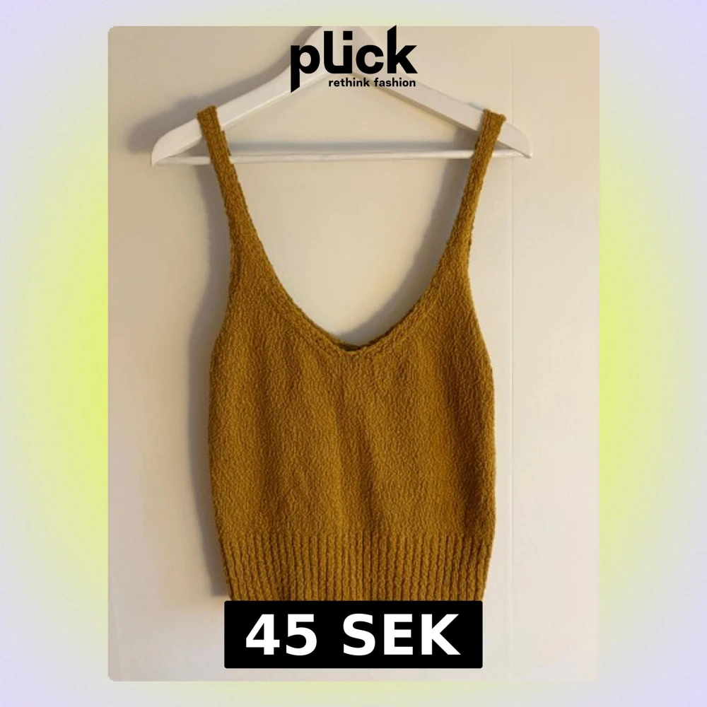 Stickad linnetopp från Lindex i en snygg senapsgul färg. Modellen är ärmlös med axelband och djup v-ringning. Toppen är ribbad nedtill och har en grovstickad struktur. Tillverkad i 100% bomull, perfekt för varma dagar.