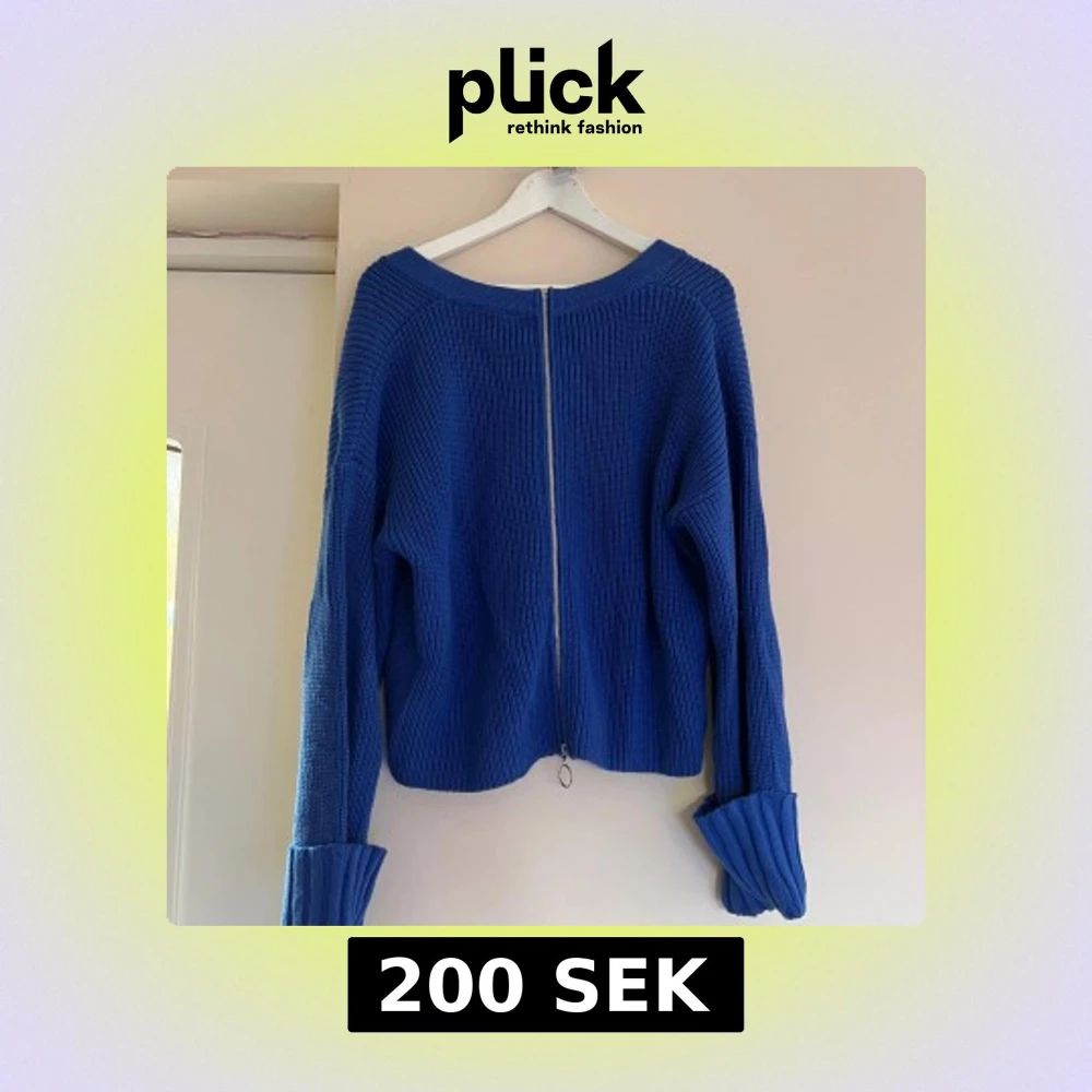 Säljer en blå stickad tröja från Lindex med v-ringning och lång ärm. Tröjan har en snygg silverfärgad dragkedja bak och breda muddar vid ärmsluten. Perfekt för dig som gillar en chill och trendig look.