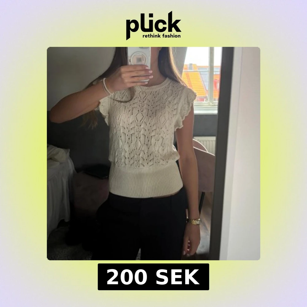 Säljer en söt vit stickad topp från Lindex i storlek S. Toppen har ett fint hålmönster, volangdetaljer vid ärmarna och bred ribbad kant nedtill. 💕