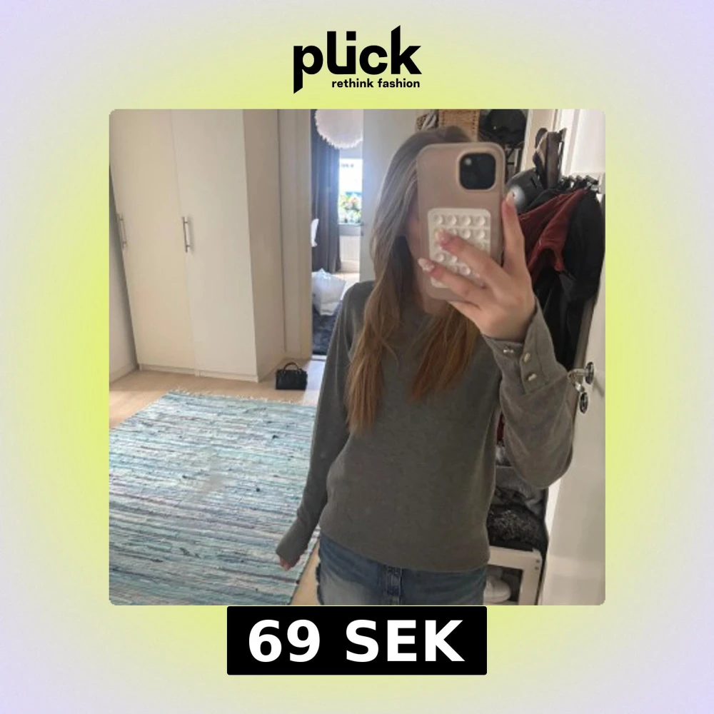 Snygg grå stickad tröja med rund halsringning och långa ärmar. Ärmsluten har dekorativa guldfärgade knappar som ger en extra touch. Perfekt till jeans eller kjol för en chill och stilren look.