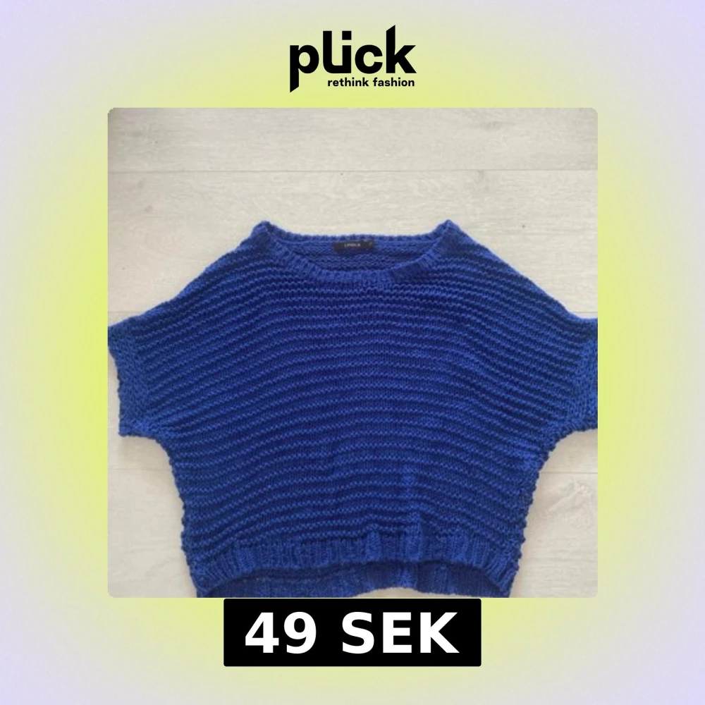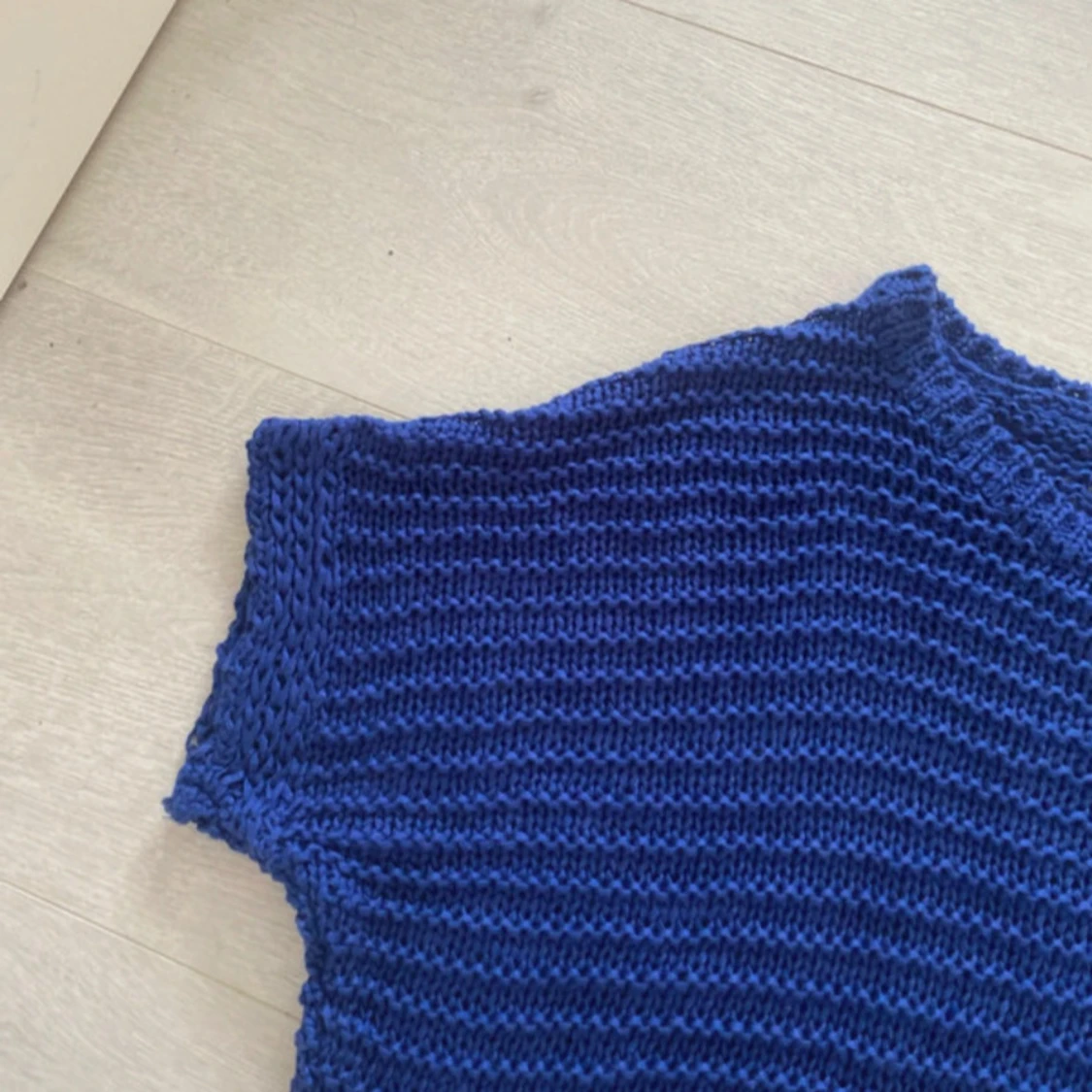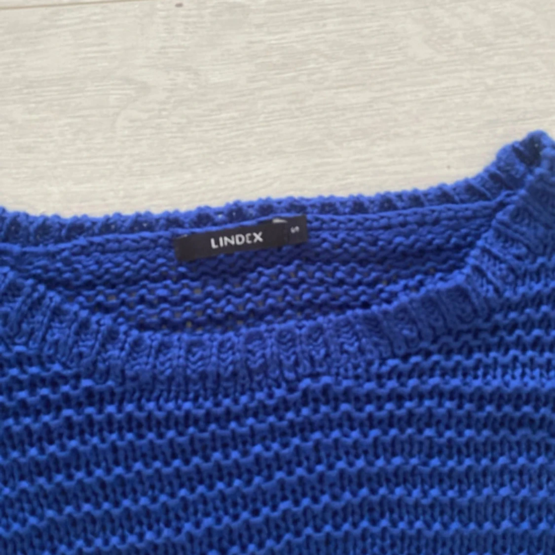 Snygg blå stickad tröja från Lindex i croppad modell med korta ärmar och rund hals. Tröjan har grovstickad struktur och ribbad kant nedtill och vid halsen.