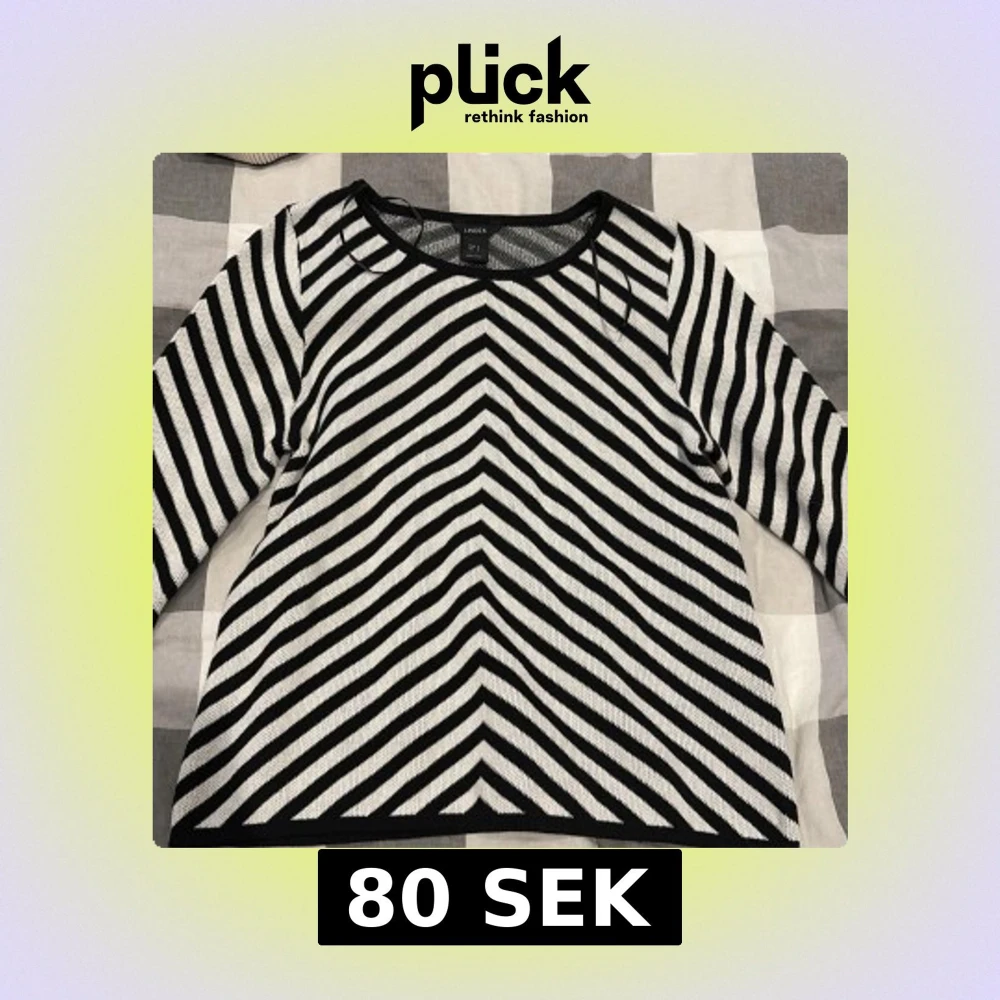 Snygg stickad tröja från Lindex i storlek S. Tröjan har ett coolt svartvitt randigt mönster med V-formade linjer framtill och långa ärmar. Perfekt för dig som gillar grafiska mönster och vill sticka ut lite extra.
