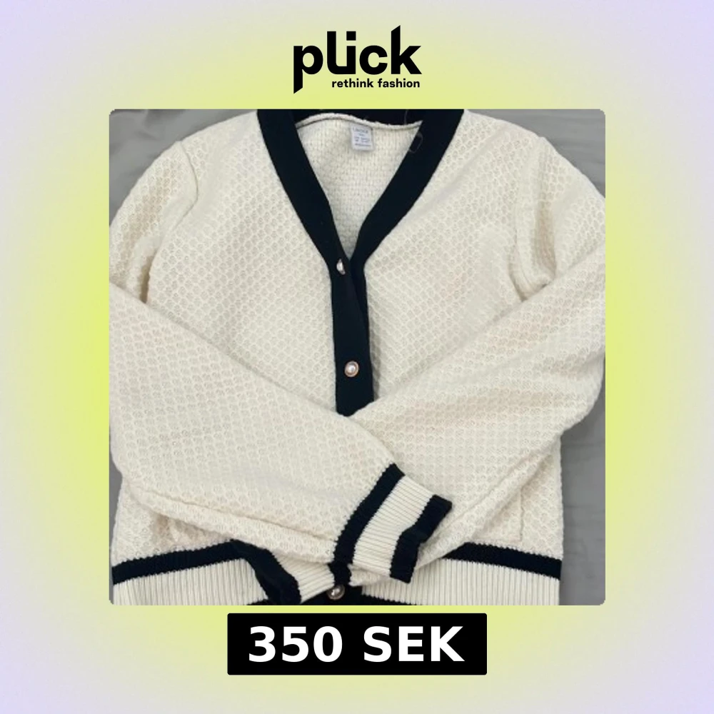 Säljer en vit stickad kofta med svarta ribbade kanter och knappar framtill. Koftan har lång ärm och ett klassiskt, elegant utseende med strukturstickat mönster. Perfekt att slänga över en topp för en snygg look.
