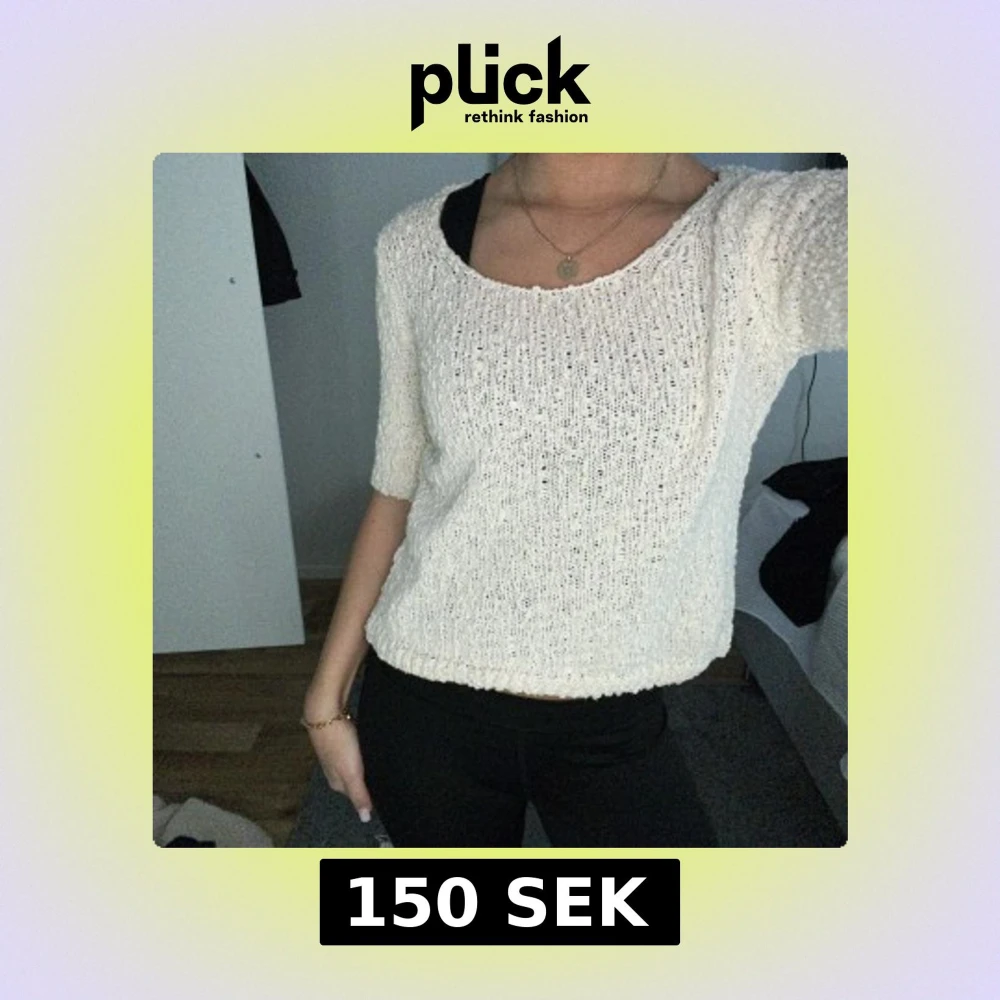 Säljer en vit stickad tröja med rund halsringning och kortare ärmar.