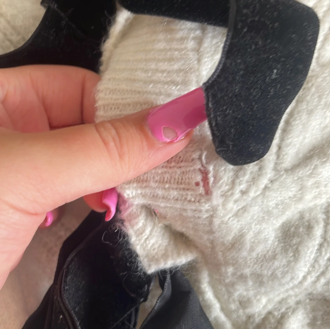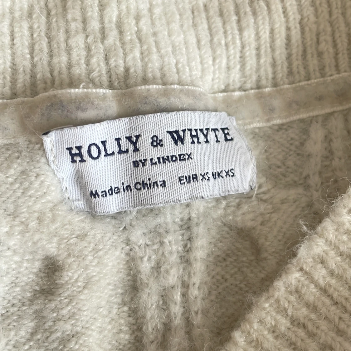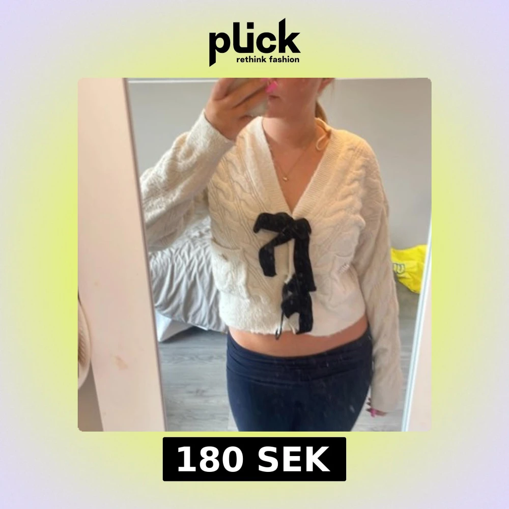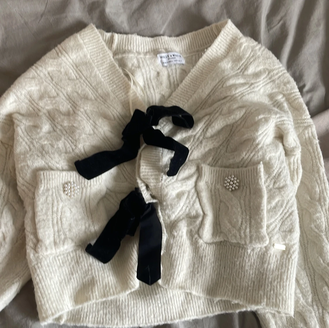 Vit stickad tröja med svarta rosetter, den har ett litet hål vid kanten bredvid en utav rosetterna, säljer denna då den inte kommer till användning nypris 300
