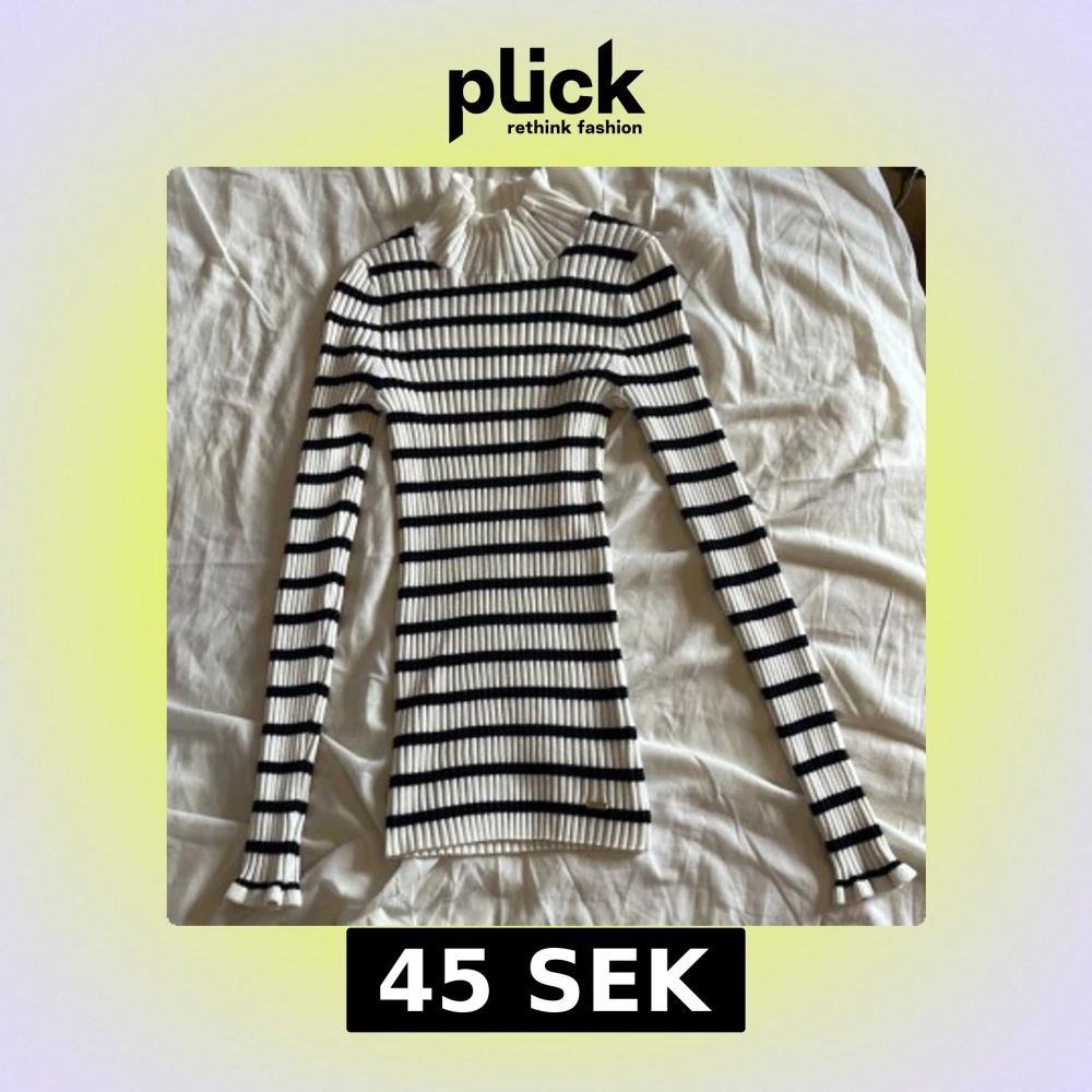Supersnygg ribbad polotröja med svarta och vita ränder. Tröjan har lång ärm, hög krage med volangkant och figurnära passform. Perfekt för dig som gillar klassisk stil med en twist. Materialet är stretchigt och mjukt.