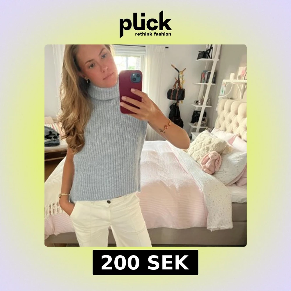 Superfin ljusblå stickad polotopp med bred ribbad struktur. Toppen är ärmlös och har öppna sidor med knytband i midjan för en cool och avslappnad look. Perfekt att styla med jeans eller kostymbyxor för en trendig vibe.