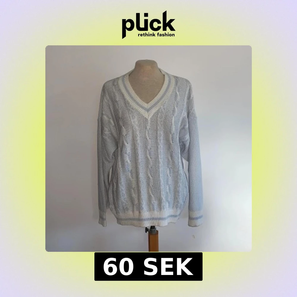 Ljusblå stickad tröja med v-ringning och vita detaljer vid hals, ärmslut och nederkant. Har ingen lapp men gissar att det är storlek M