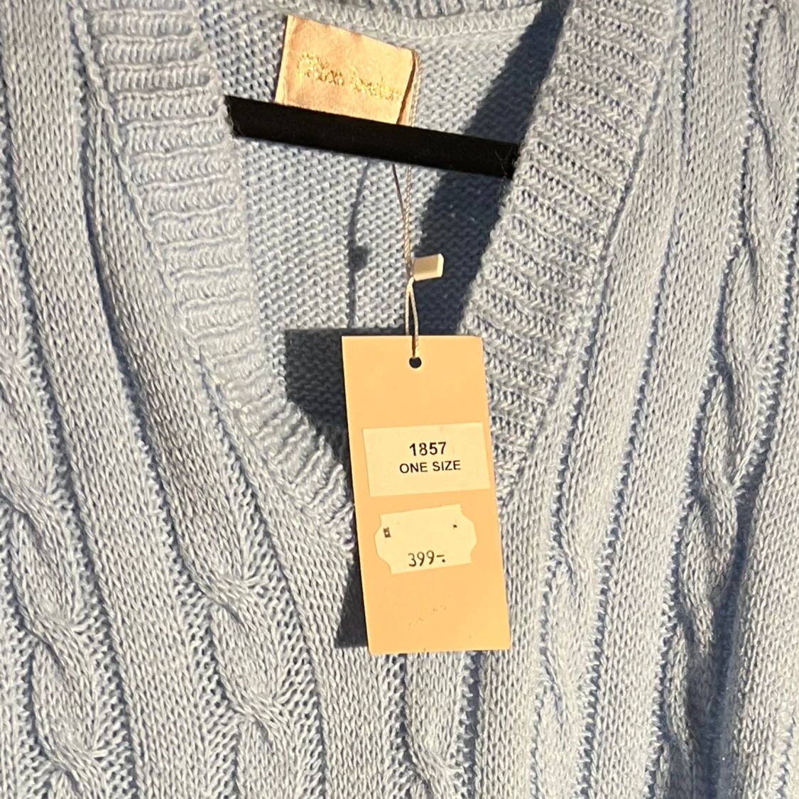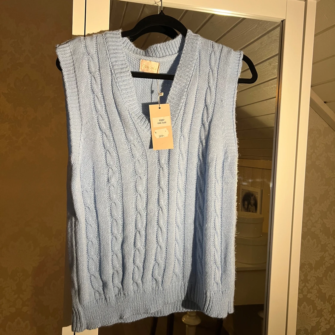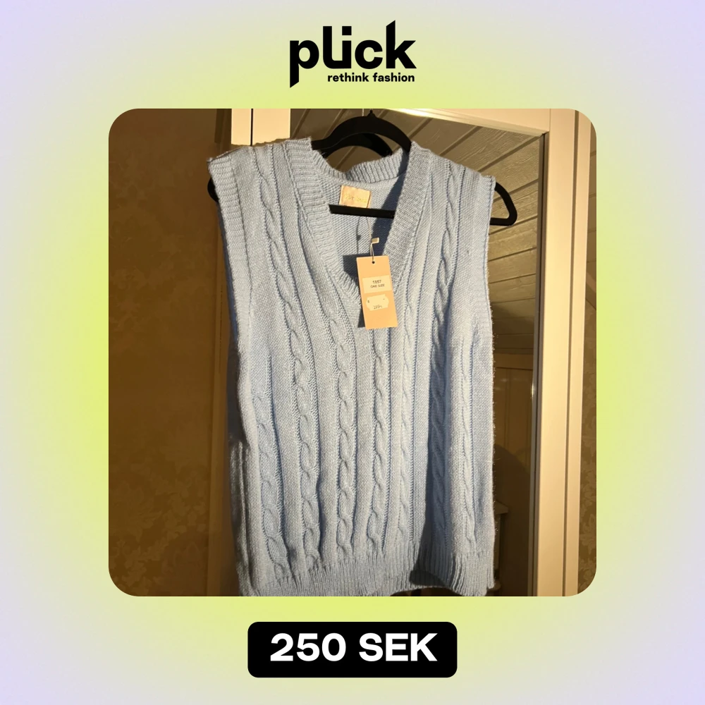 Säljer en superfin ljusblå stickad väst från Zara Knit. Den har ett snyggt flätmönster och är perfekt för lager-på-lager-stil. Västen är i nytt skick och passar till både vardag och fest. Perfekt för vår och sommar!