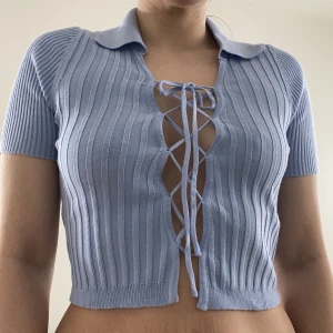 Ljusblå stickad topp med snörning. Köpt secondhand, lapp bortklippt, skulle gissa att storleken är S. Bra skick