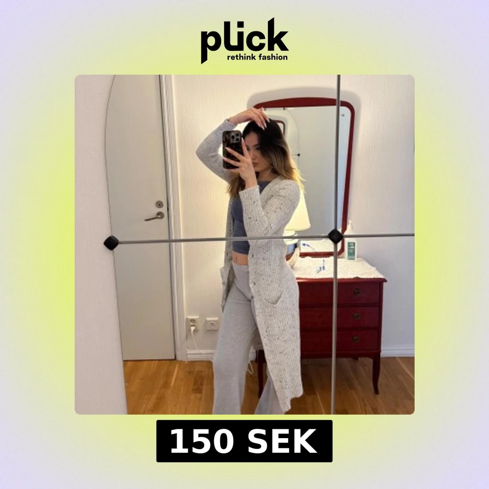 Säljer en lång, ljusgrå kofta med knappar och två stora fickor framtill. Koftan är ribbstickad och har slitsar på sidorna samt långa ärmar. Perfekt att slänga över en topp för en chill look. Är i jätte fint skick och köpt på Gina Tricot, finns inte längre tillgänglig i butik och är i storlek S.