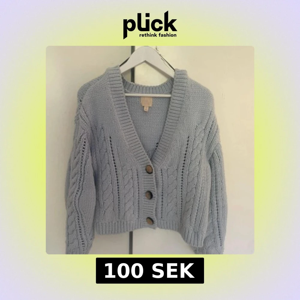 Superfin ljusblå stickad kofta med kabelstickat mönster och tre stora knappar framtill. Koftan är croppad och har långa ärmar samt bred ribbad kant vid ärmslut och nederkant🩵